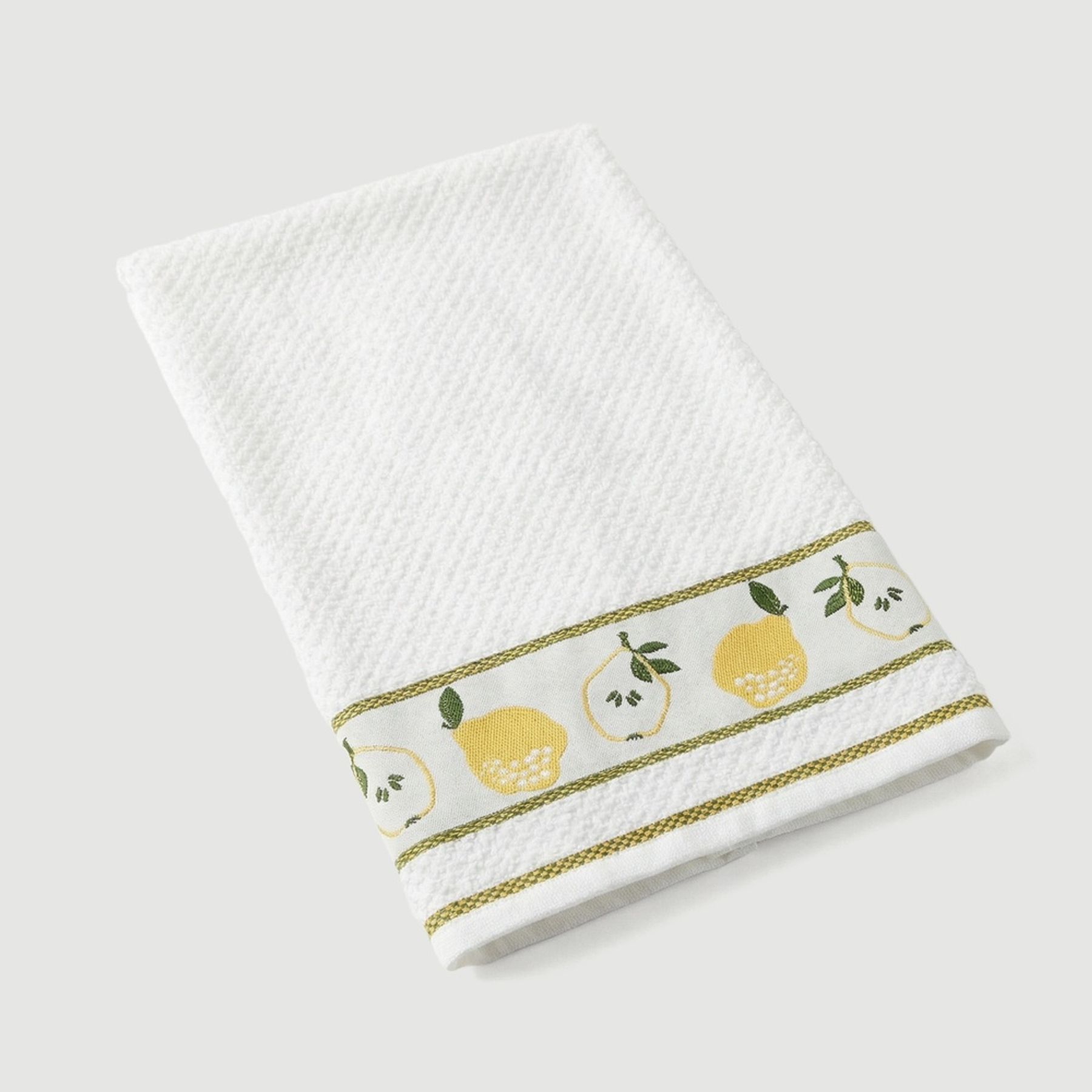 A base branca é valorizada por uma faixa decorativa com peras amarelas e folhas verdes, finalizada com costura em linha verde. Ideal para compor a cozinha com charme e simplicidade.
