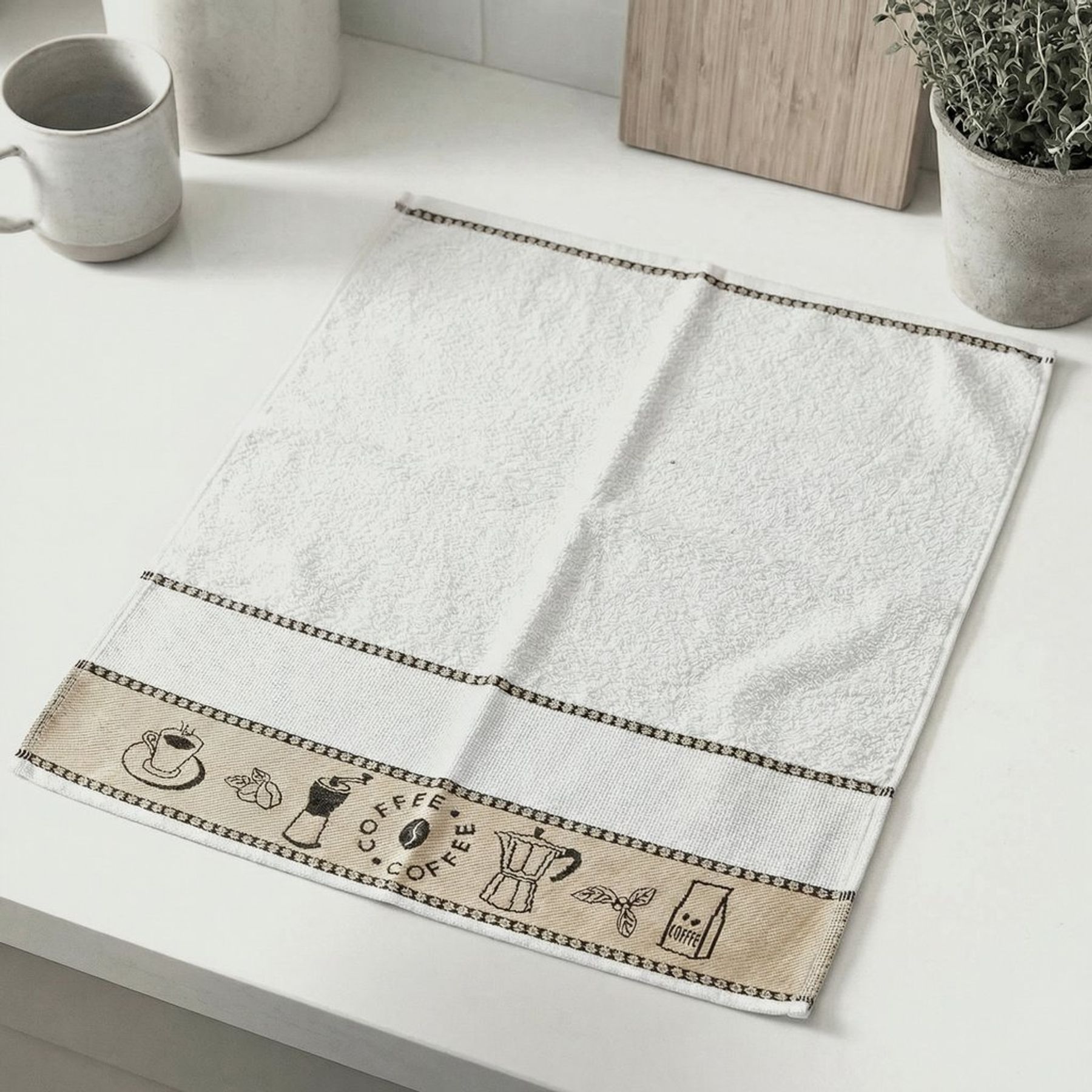 A barra inferior estampada traz temática de café, com ilustrações de xícara, cafeteira e grãos, além da palavra “COFFEE” em destaque. O acabamento em bainha e as faixas com pontilhado nas bordas complementam o design, deixando a peça charmosa para uso e para decorar a cozinha.