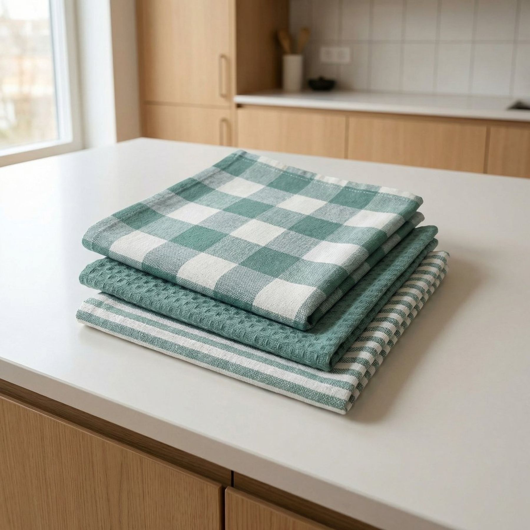 Economia de R$ 5,00O kit de pano de copa Basic é uma opção prática para a cozinha, com 3 peças em 100% algodão e boa absorção. O conjunto traz variação de padronagens em verde, facilitando a organização da rotina: 1 pano xadrez, 1 pano liso texturizado tipo waffle e 1 pano com listras finas. Produto Pernambucanas Casa.
