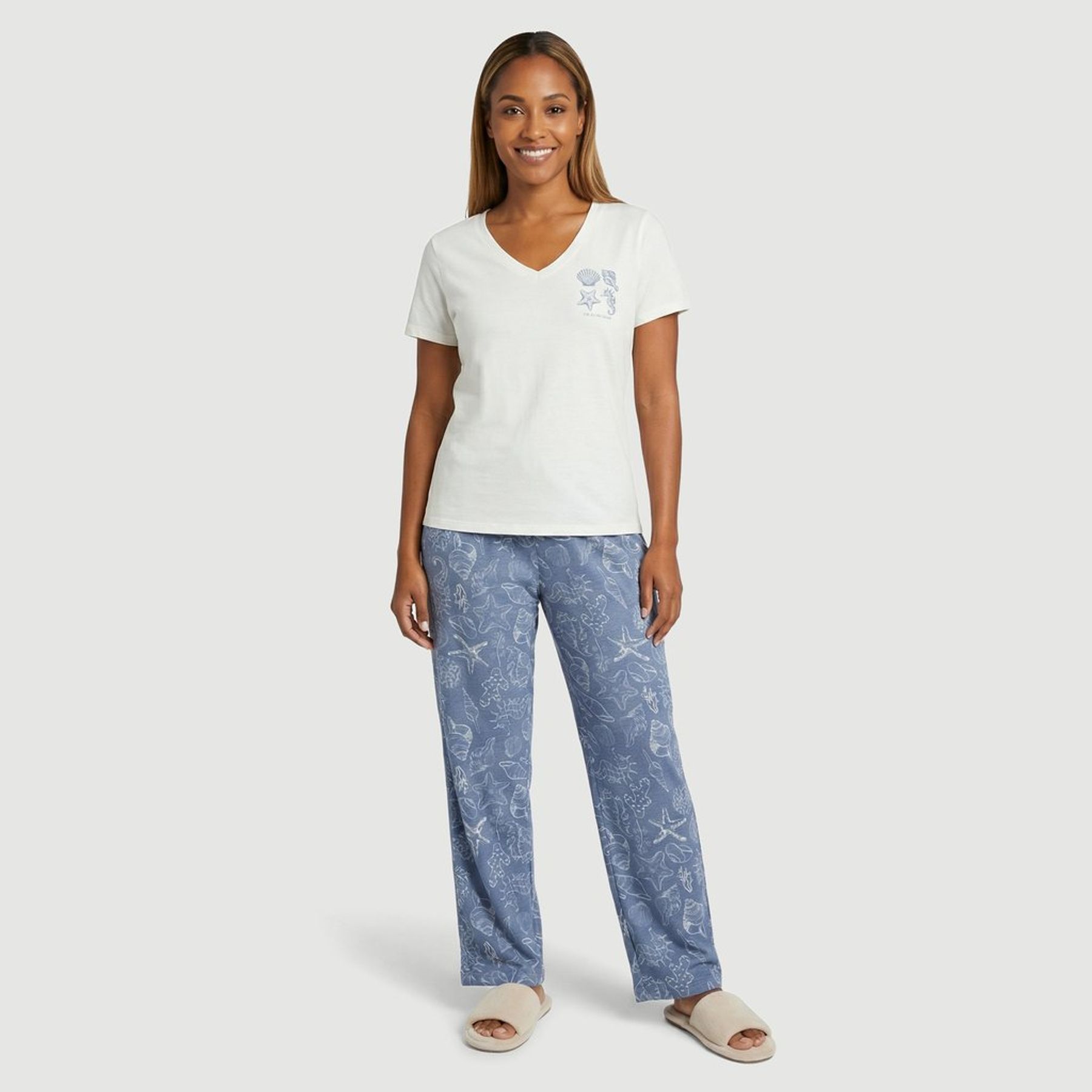 Economia de R$ 12,00O pijama feminino Uniq em malha é ideal para dormir e relaxar. O conjunto traz blusa lisa bege com manga curta, decote V e pequeno detalhe estampado no peito, combinada com calça comprida azul com estampa marinha de conchas e estrelas-do-mar. A composição mista com predominância de poliéster e o cós com elástico ajudam no ajuste e na praticidade.