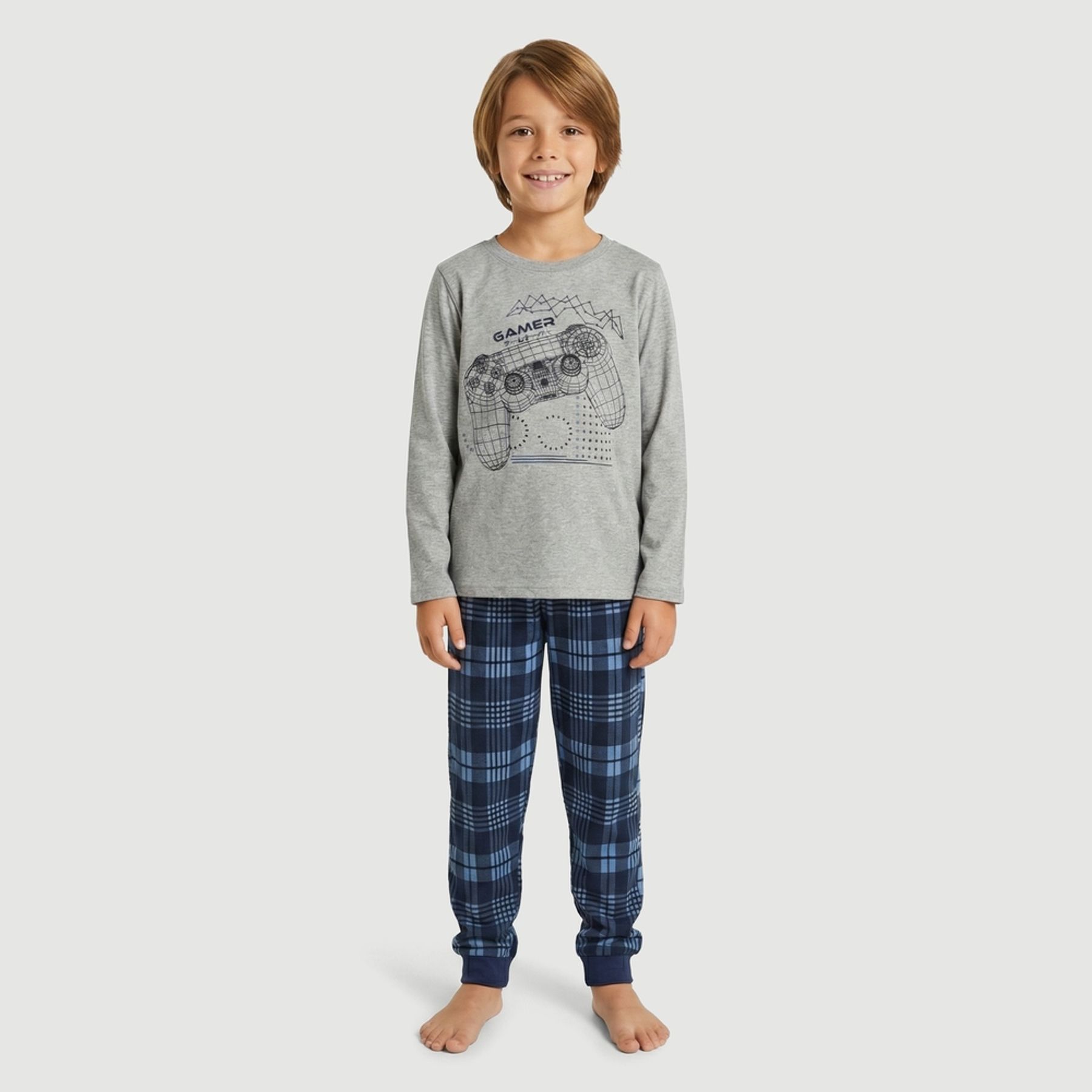 A blusa de manga longa possui gola redonda e estampa frontal centralizada com tema gamer (controle de videogame) em base cinza mescla. A calça completa o conjunto com padrão xadrez em tons de azul e preto, cós com elástico e punhos na barra para melhor ajuste.
