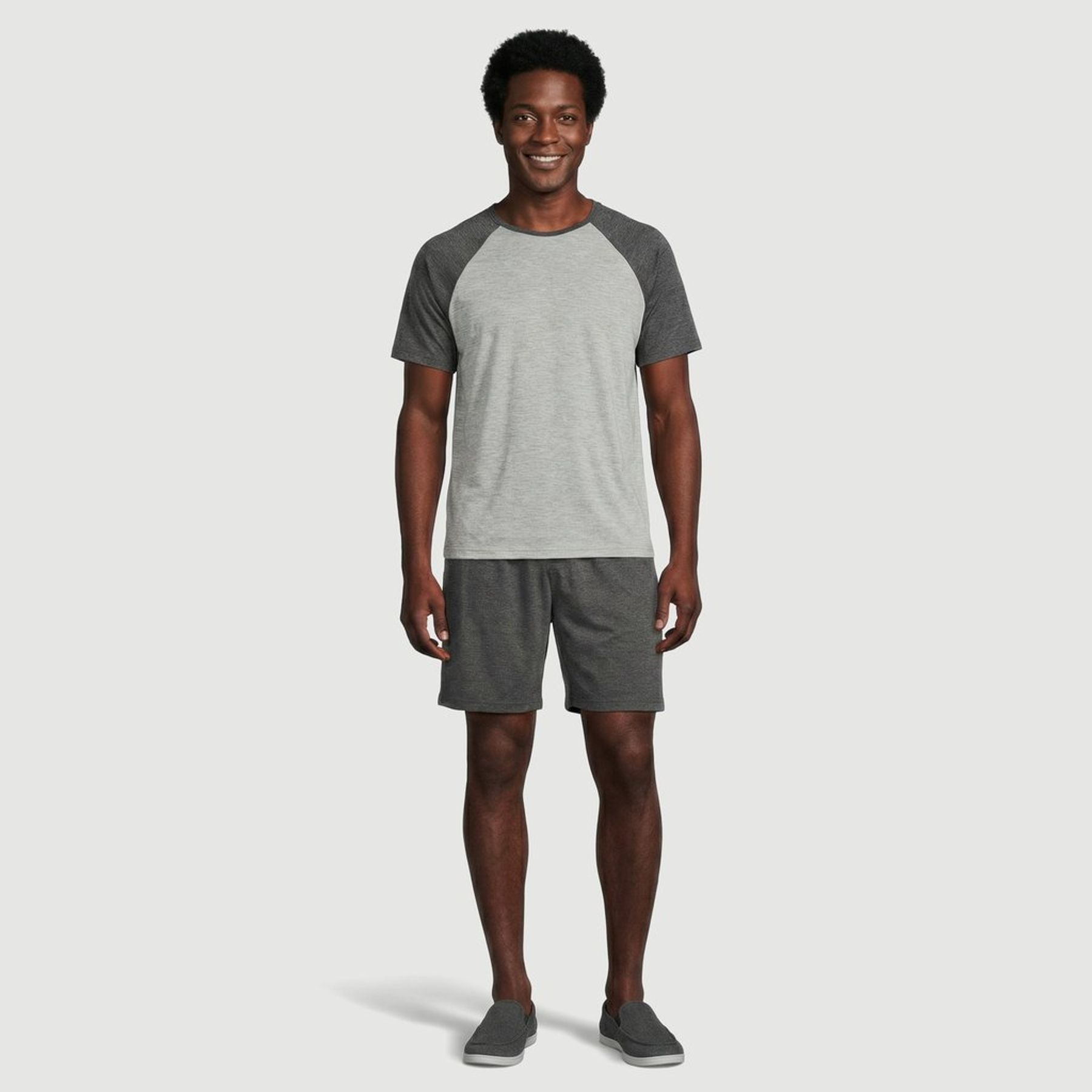 O conjunto vem com 01 camiseta de gola redonda e mangas raglan em tom de cinza mais escuro, além de 01 short liso com cós elástico, garantindo ajuste confortável. Visual básico e versátil em tons de cinza, perfeito para quem busca um pijama masculino liso e funcional.