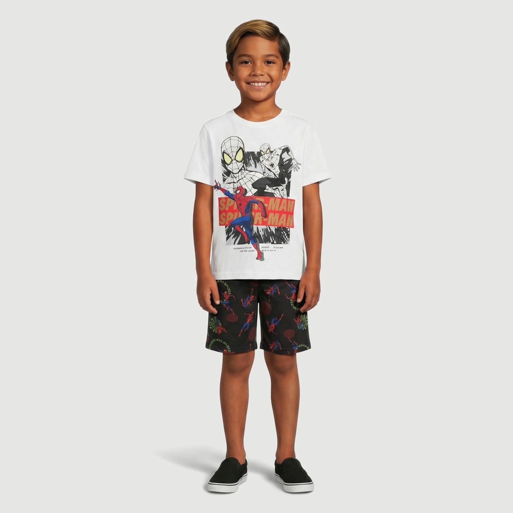 A camiseta tem manga curta, gola redonda e estampa frontal centralizada com o personagem e o texto “SPIDER-MAN”. A bermuda possui cós elástico e estampa repetida com o Homem-Aranha e teias.