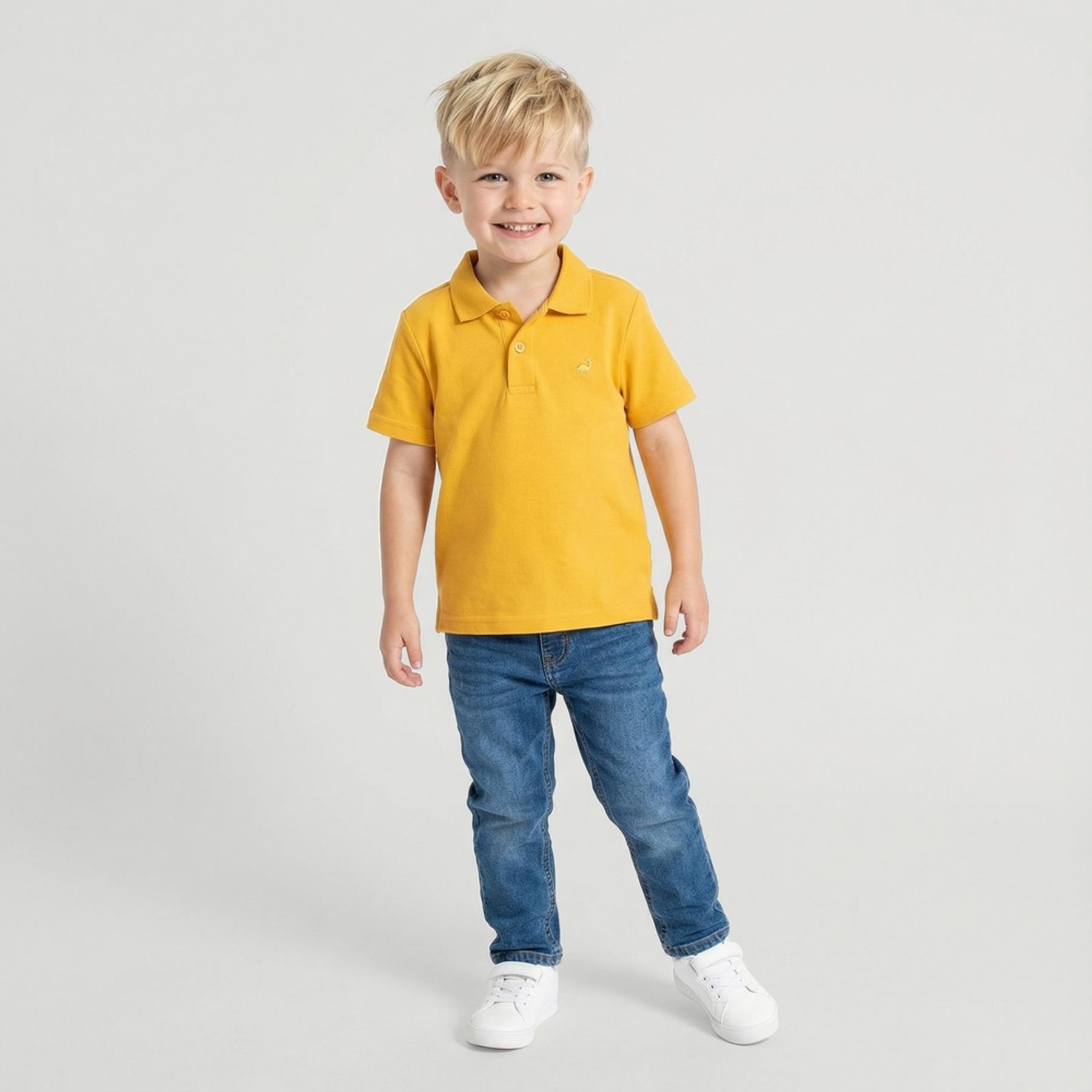 A camisa polo infantil é uma opção prática para compor looks clássicos com um toque divertido. Confeccionada em malha piquet com predominância de algodão, oferece boa respirabilidade e toque agradável. O destaque fica por conta do pequeno bordado de dinossauro no peito, que adiciona personalidade à peça sem pesar no visual.