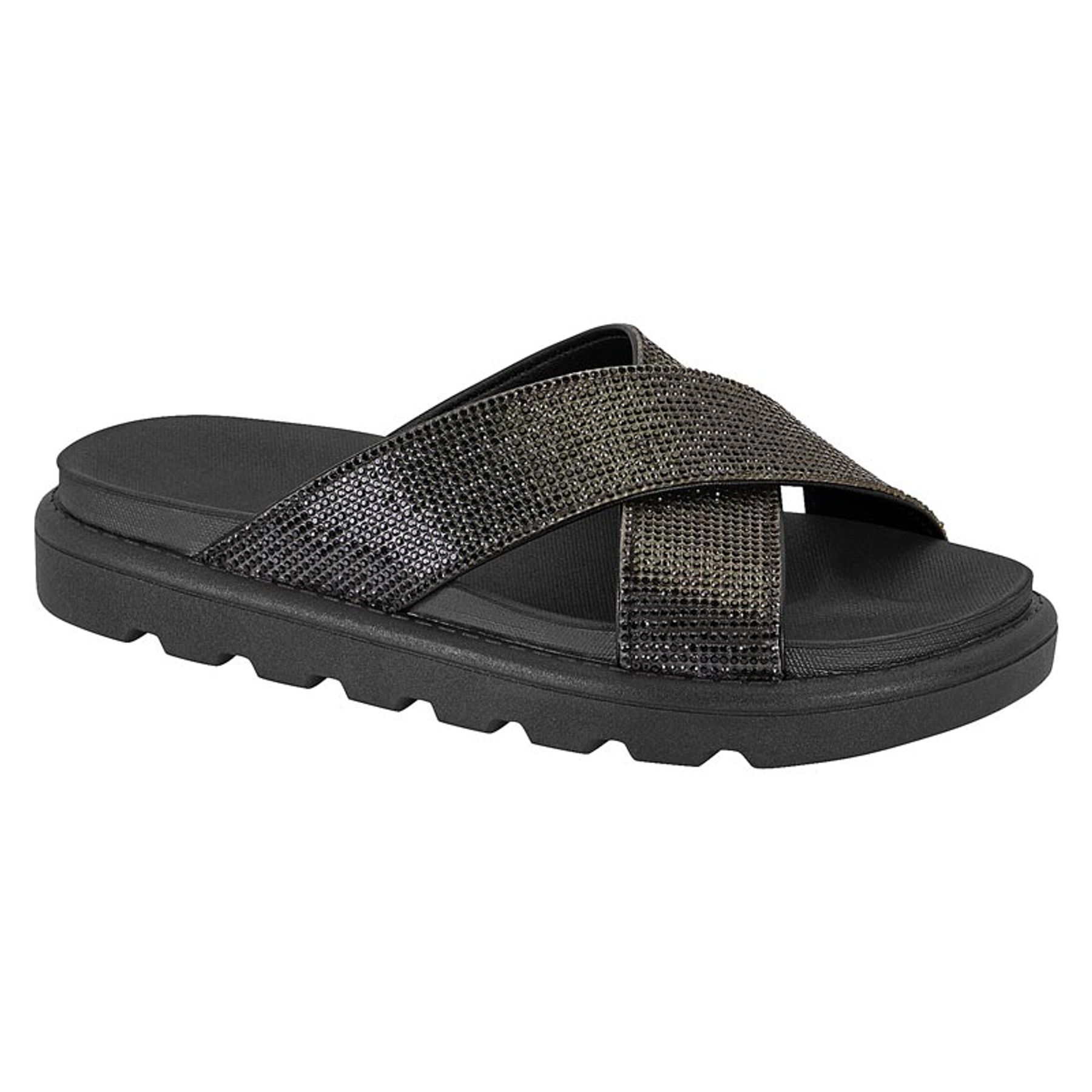 Rasteira slingback tiras brilho preta - Via Uno