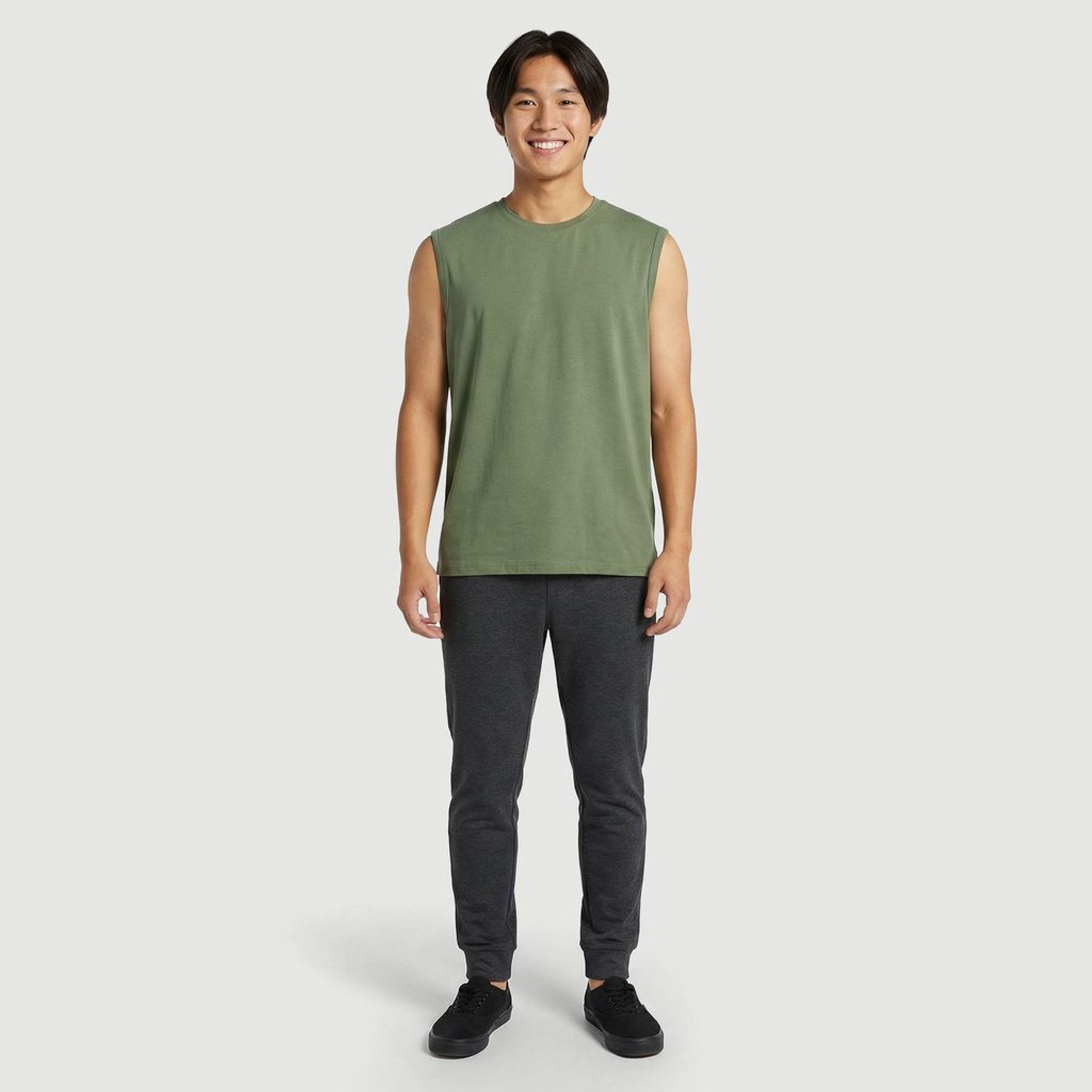 O modelo sem manga tem gola careca (redonda), cavas amplas com acabamento em viés e barra simples. A cor verde lisa facilita as combinações com bermuda ou jeans em diferentes ocasiões.