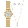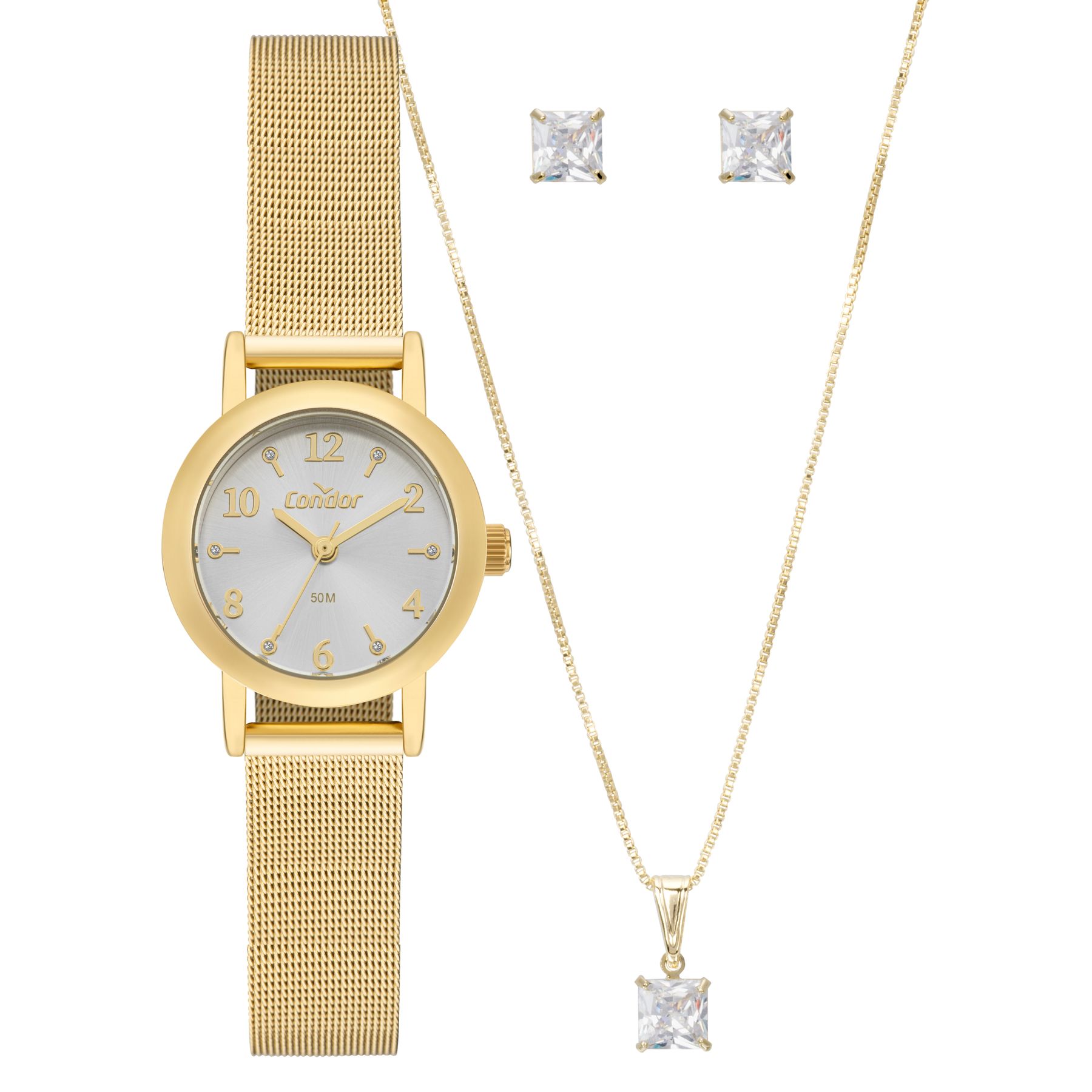 A versão mais encantadora do tempo. O kit traz um relógio com caixa pequeno, pulseira de mesh em banho dourado e brilho no mostrador prata. Com resistência à água e design versátil, é perfeito para presentear quem você ama.