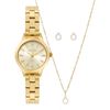 A versão mais encantadora do tempo. O kit traz um relógio com caixa pequeno, pulseira em 3 links em banho dourado e brilho no mostrador prata. Com resistência à água e design versátil, é perfeito para presentear quem você ama.