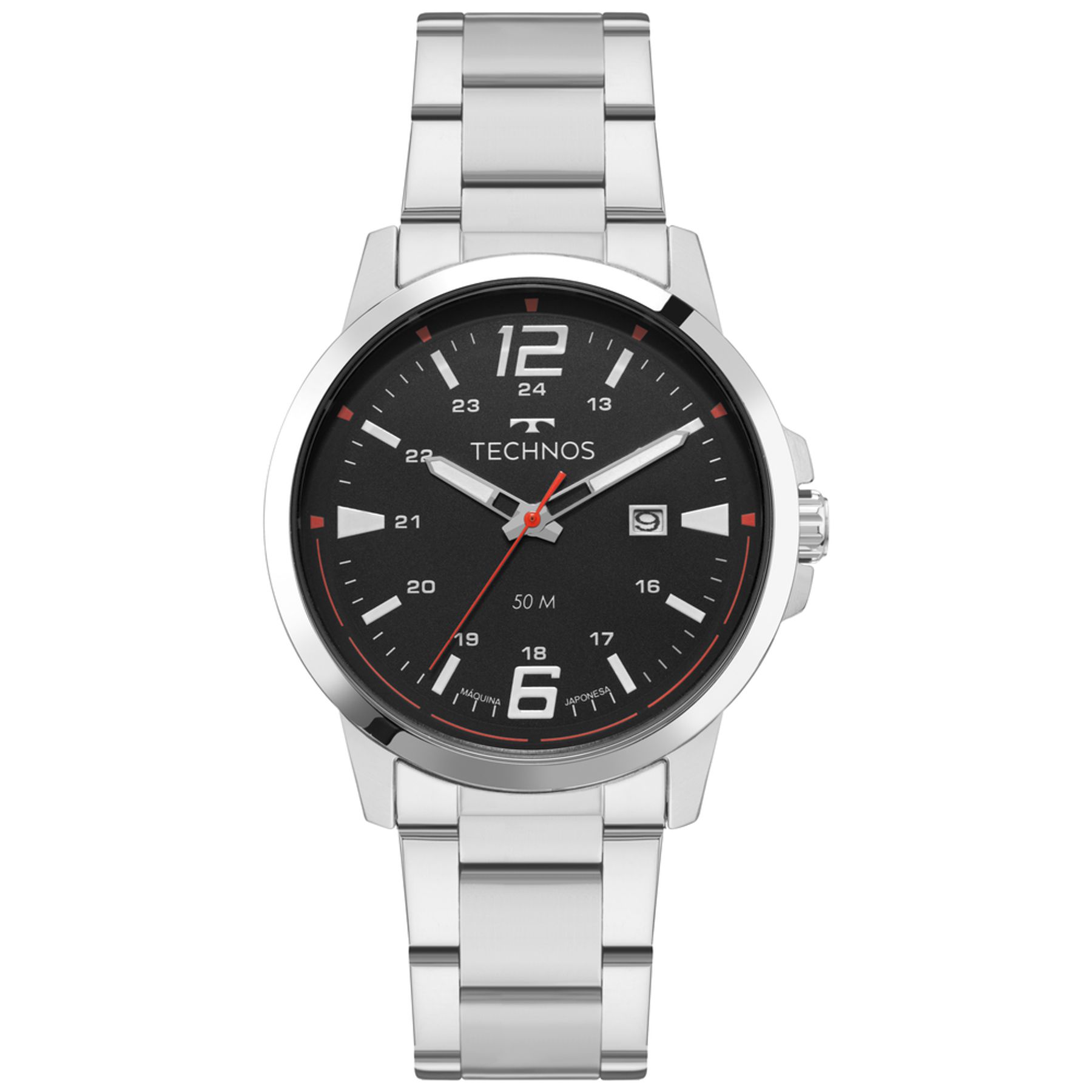 A linha Technos Racer traz lançamentos de design esportivo com mostrador de fácil leitura e numeração arábica nas posições de 6/12 horas que reforça sua identidade. O detalhe em cor de destaque garantem estilo moderno, enquanto a máquina japonesa assegura precisão e confiança aos modelos. Disponível com pulseira de aço inoxidável em 3 links e mostrador na versão preta Modelos com resistência à água de 50 metros e tamanho de caixa de 43mm.