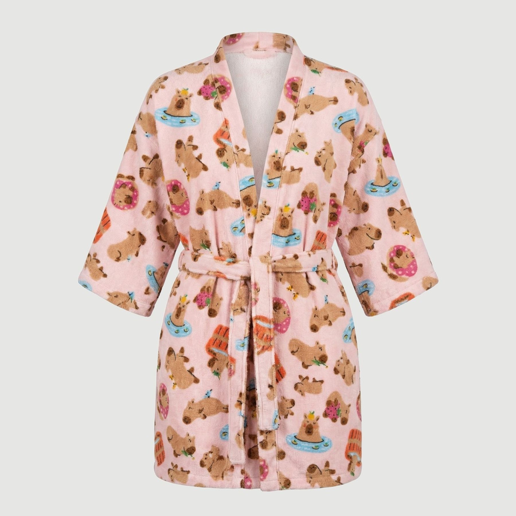 O modelo tipo roupão tem gola aberta, mangas 3/4 e faixa para amarrar na cintura, oferecendo ajuste prático no uso diário. A estampa de capivaras com bóias e detalhes coloridos em fundo rosa deixa o visual alegre e divertido. Produto Pernambucanas Casa.