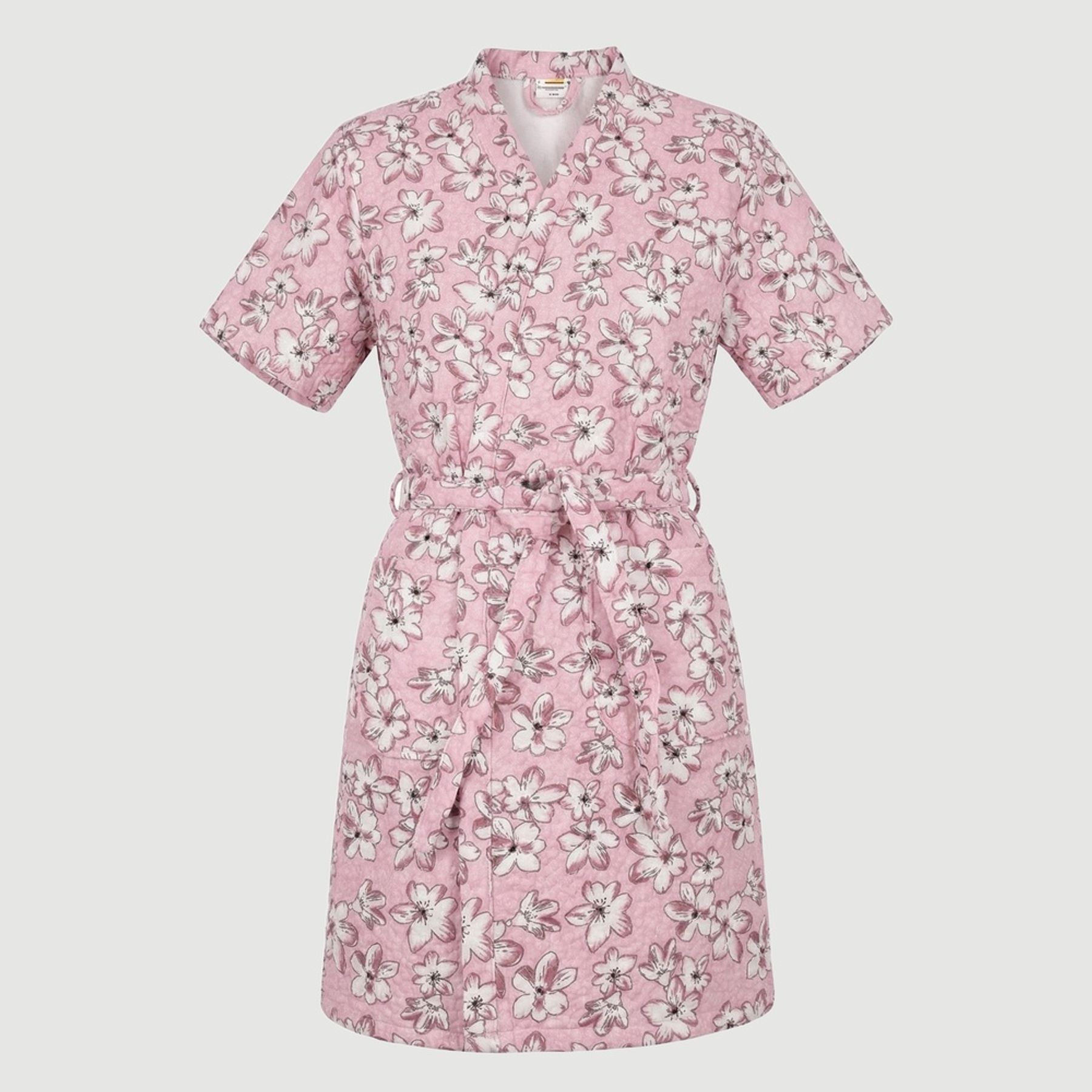 A modelagem curta tem manga curta, gola tipo xale em V e faixa para amarração na cintura, proporcionando ajuste ao corpo e liberdade de movimento. Os bolsos frontais adicionam praticidade à rotina. Itens inclusos: 01 roupão.