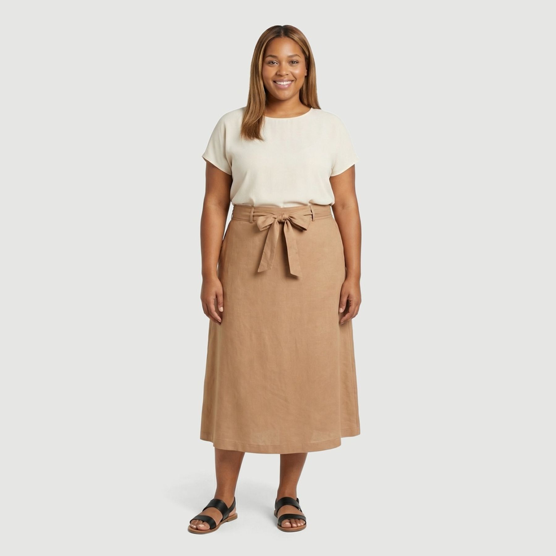 O cós com passantes e a faixa do mesmo tecido permitem ajustar a cintura com amarração frontal, valorizando a silhueta. A modelagem midi e a barra simples garantem um acabamento clean, fácil de combinar com camisas, blusas e regatas.