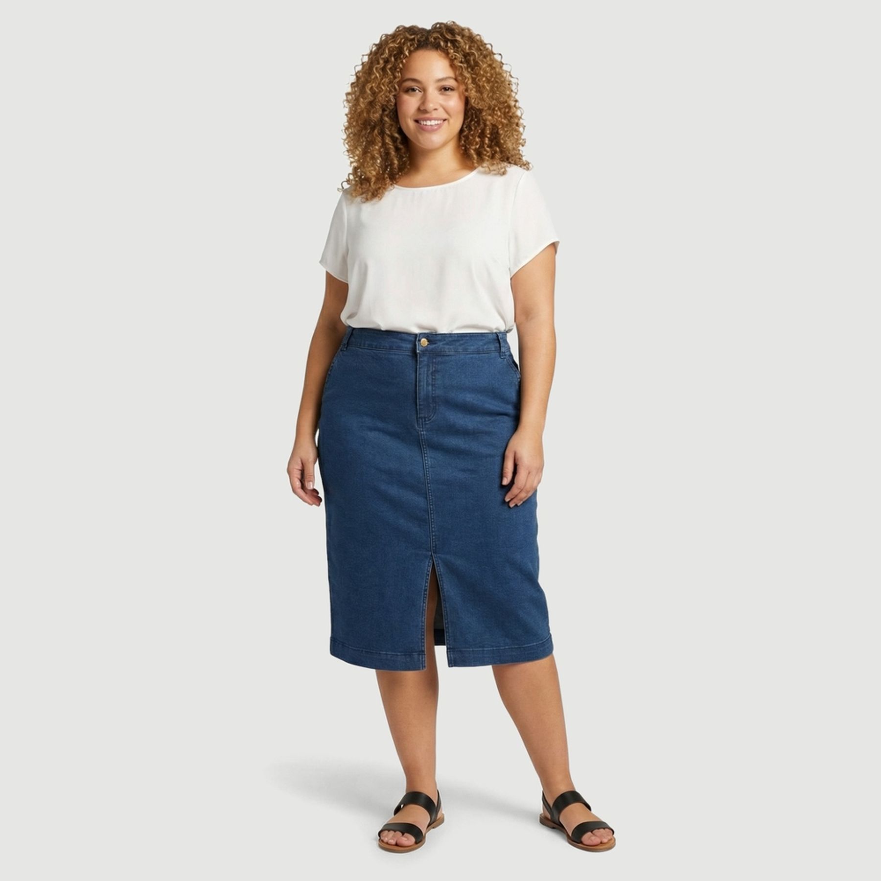 Economia de R$ 16,00A saia jeans feminina Ink traz um visual clean e versátil para compor looks com praticidade. Em lavagem azul média, possui modelagem midi e fenda frontal na barra, que facilita o movimento e atualiza o clássico. O cós com passantes, o fechamento por zíper e o botão dourado completam o design, junto aos bolsos frontais embutidos e à costura central frontal. Confeccionada em composição mista com predominância de algodão, é uma peça fácil de combinar com camisetas, camisas e diferentes tipos de calçados.