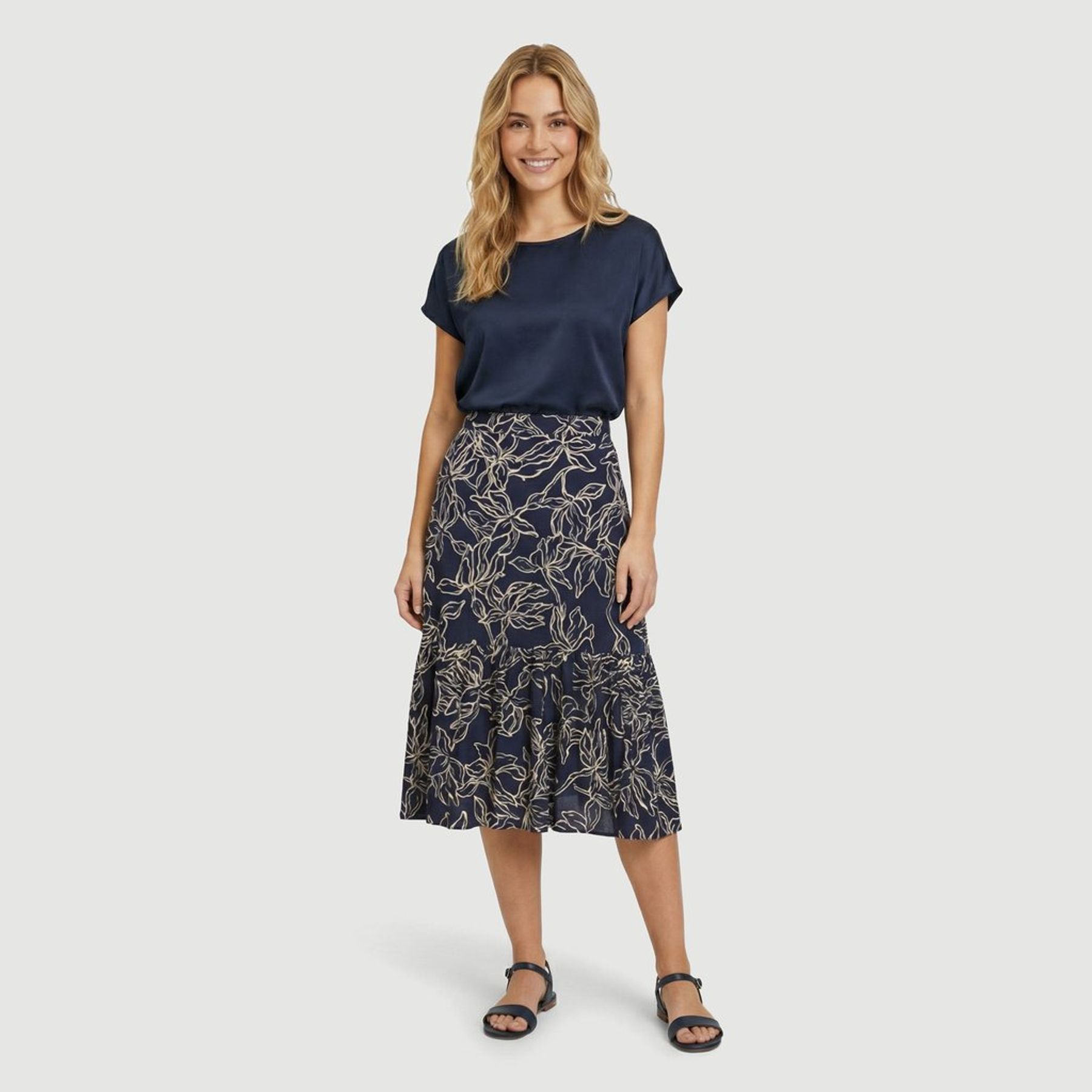 Confeccionada em tecido misto com predominância de viscose, tem toque macio e bom movimento. A estampa floral total em contraste sobre o fundo marinho traz um efeito elegante, e o recorte com franzido na parte inferior adiciona volume suave, finalizado por barra ampla.