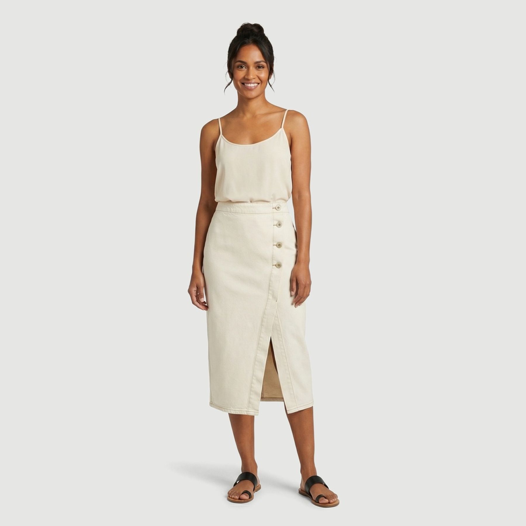 Economia de R$ 15,00Saia midi feminina Sawary em sarja 100% algodão na cor creme, ideal para compor produções modernas e versáteis. O visual liso combina com diferentes blusas e calçados, facilitando a criação de looks para diversas ocasiões.
