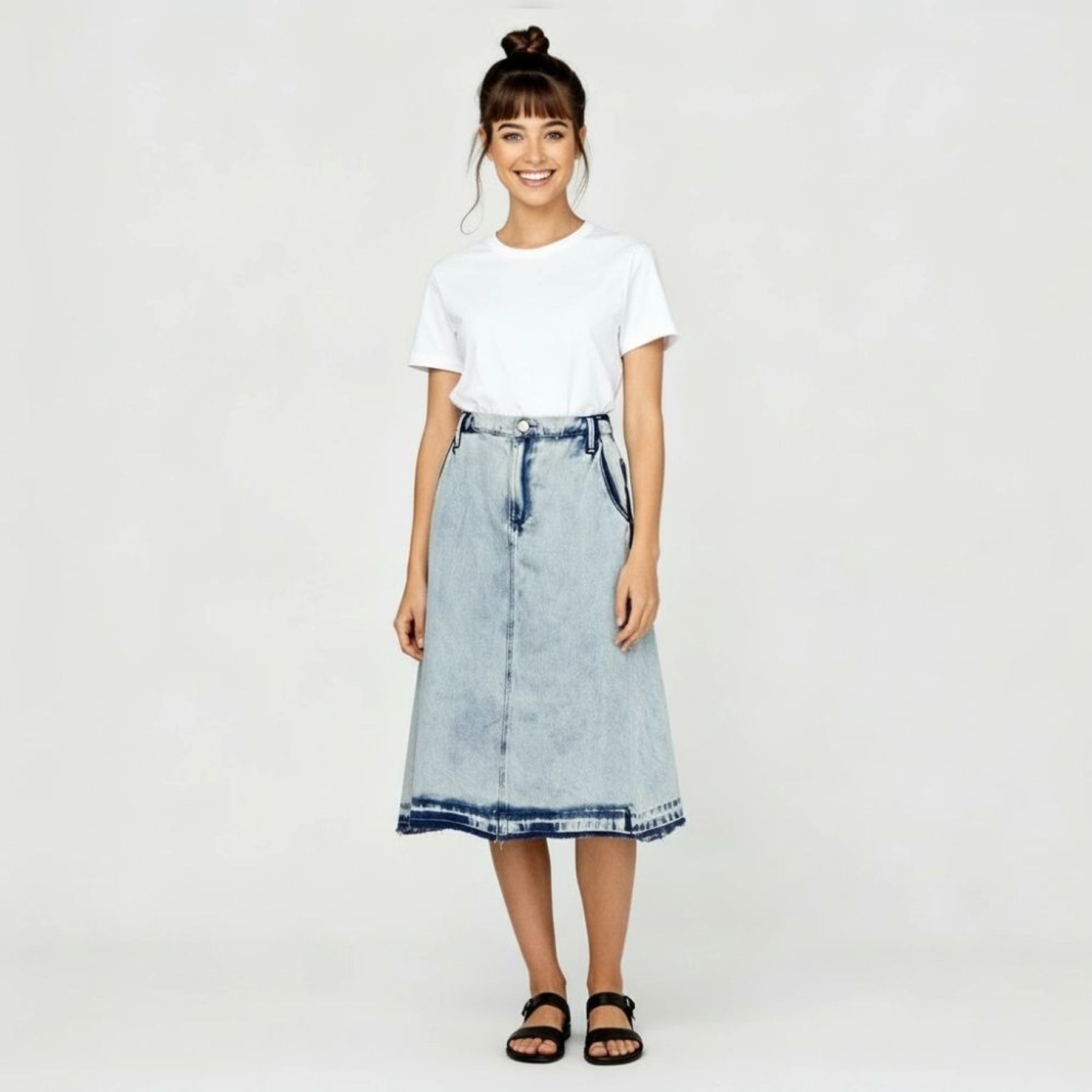 Economia de R$ 69,00A saia midi jeans feminina combina praticidade e estilo, confeccionada em tecido plano 100% algodão. Seu visual azul claro destaca o acabamento moderno com barra desfiada, perfeita para múltiplas composições. O elástico nas costas garante ajuste agradável ao corpo, ideal para quem busca elegância aliada ao bem-estar ao longo do dia.