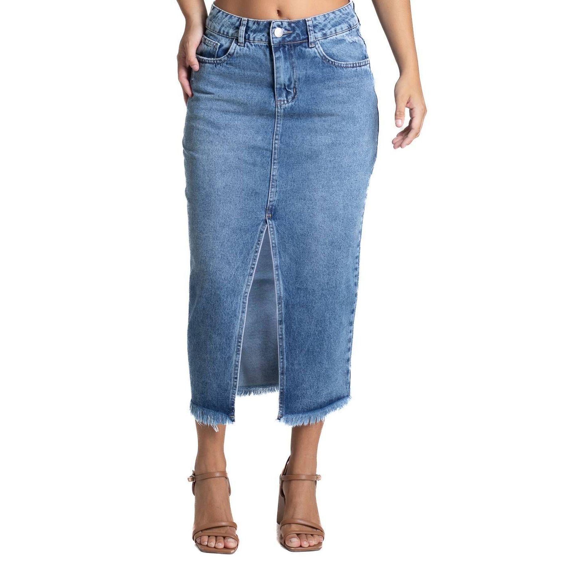 Saia Feminina Midi Jeans Barra Desfiada Azul Claro - INK