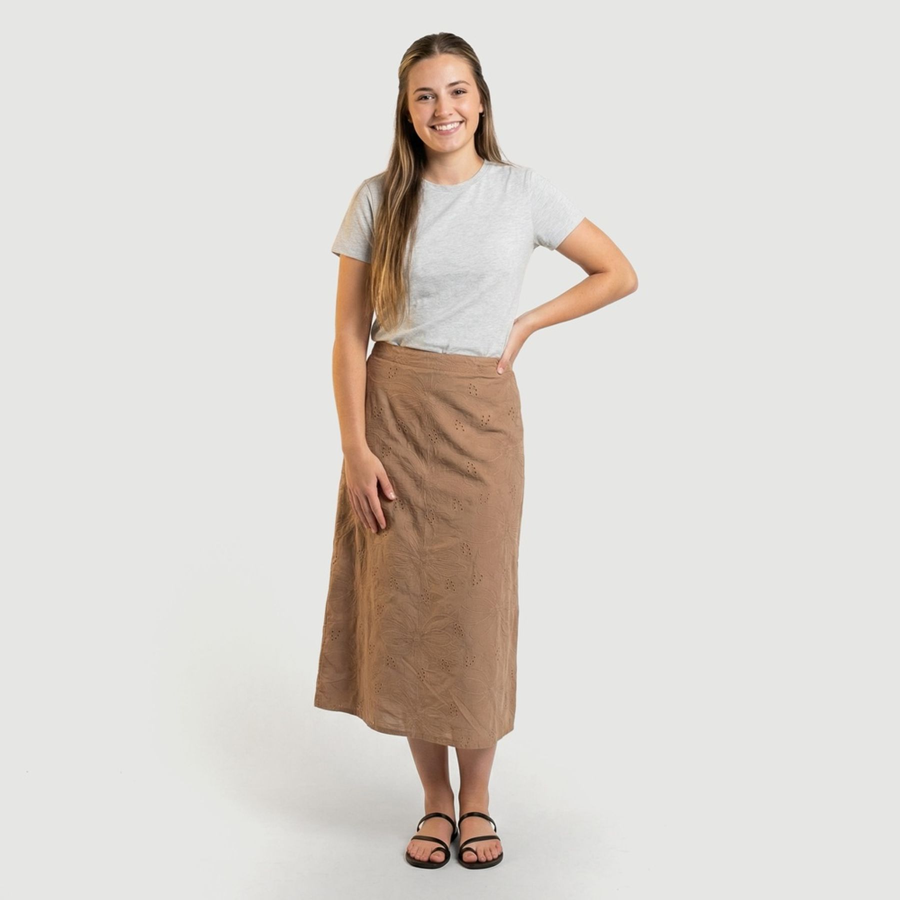 Saia Feminina Midi com Bordado Floral Bege - Viva