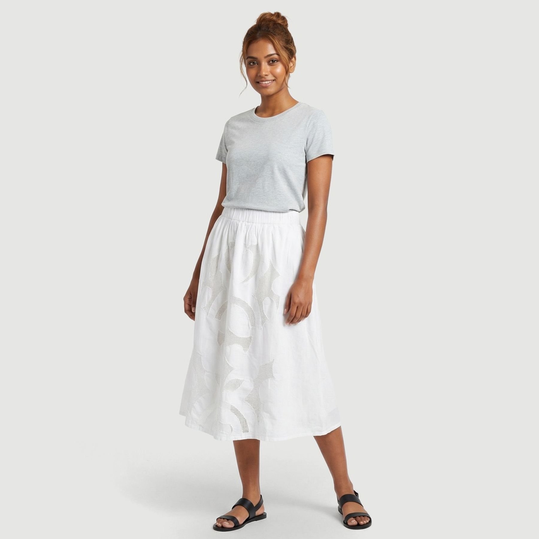 O visual liso na cor branca é valorizado pela aplicação frontal central em tom bege com desenho ornamental, criando um ponto de destaque discreto. O cós com elástico facilita o ajuste, enquanto a barra reta com costura aparente finaliza a peça com acabamento bem-feito.