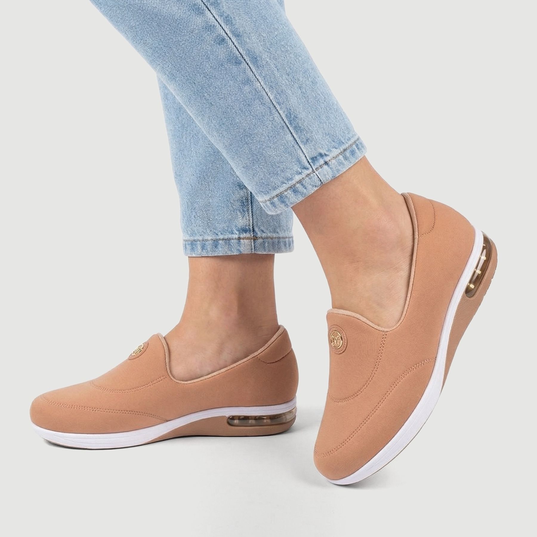 O modelo sem cadarço facilita o calce, enquanto o bico arredondado e as costuras aparentes decorativas adicionam um toque de estilo. O cabedal conta com enfeite metálico dourado discreto, e o solado branco cria contraste moderno. Para completar, possui salto baixo com detalhe translúcido, ideal para acompanhar do trabalho aos passeios com elegância.