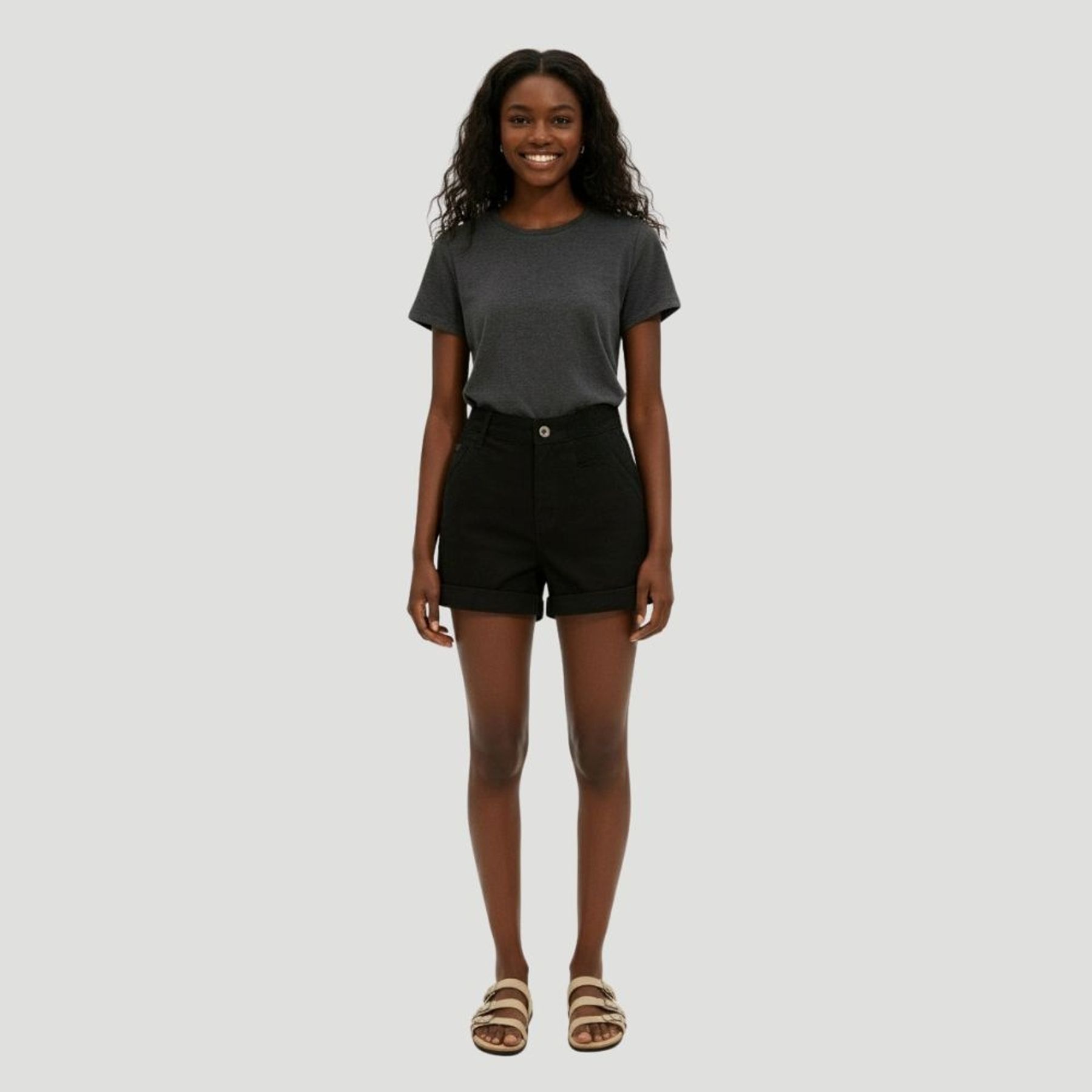 Short feminino confeccionado em tecido plano com composição predominantemente de algodão, oferecendo toque suave ao vestir. Possui design liso, cor preta versátil e botão frontal destacado, sendo uma escolha prática para diversas ocasiões. Ideal para quem valoriza um visual básico e moderno no guarda-roupa de jeans feminino.