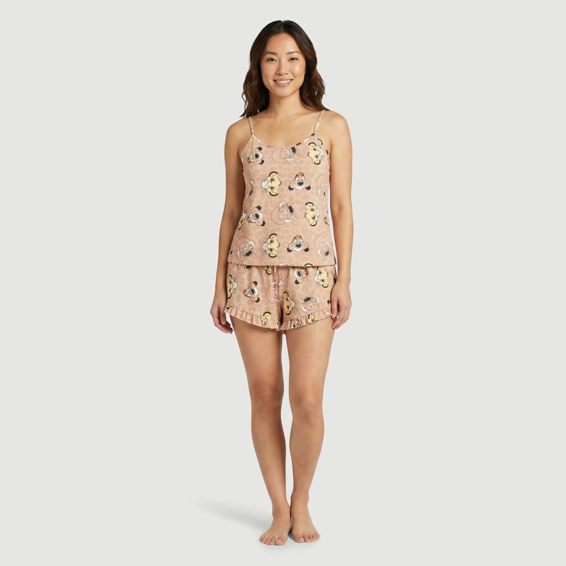 Economia de R$ 8,00O short doll feminino Disney O Rei Leão é ideal para dormir e relaxar com estilo. O conjunto inclui blusa regata de alça fina com decote arredondado e short com cós elástico, amarração decorativa frontal e babado/ruche na barra.
