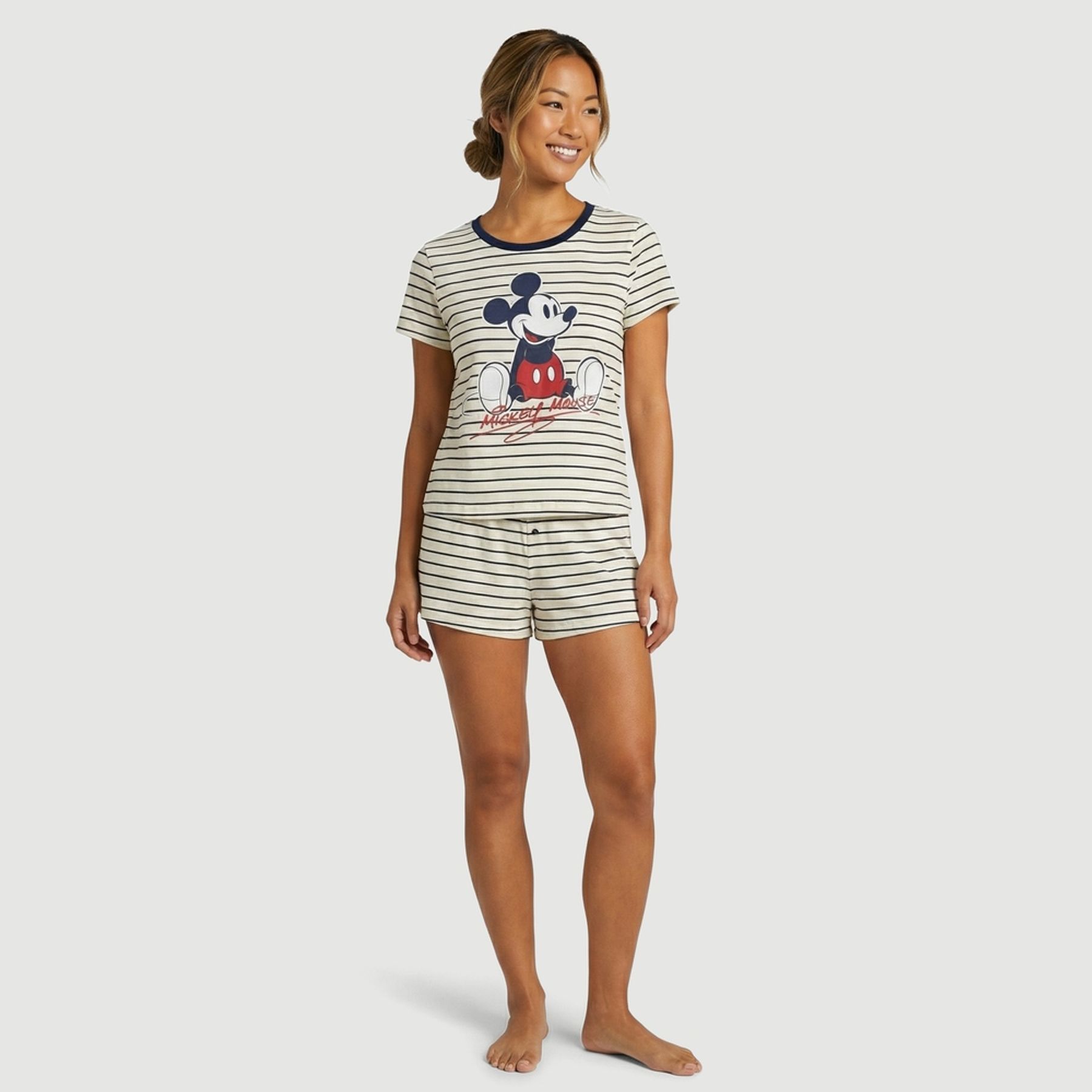 Economia de R$ 20,60O short doll feminino Disney é ideal para dormir e relaxar em casa. Confeccionado em malha de composição mista com predominância de algodão, conta com camiseta de manga curta e gola redonda com viés contrastante azul-marinho, além de estampa frontal do Mickey Mouse com escrita. O conjunto traz listras finas em azul-marinho sobre fundo creme. O short tem cós elástico, botões decorativos frontais e barra levemente arredondada nas laterais. Itens inclusos: 01 camiseta e 01 short.