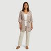 Economia de R$ 8,00Robe feminino Uniq confeccionado em malha de composição mista com predominância de poliéster. Possui manga curta, decote redondo e modelagem com transpasse, acompanhada de faixa para amarração na cintura, proporcionando ajuste prático. A estampa geométrica em marrom sobre fundo creme (off-white) cria um visual elegante para uso em casa.