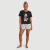 Economia de R$ 8,00Pijama feminino modelo short doll em malha, ideal para relaxar e dormir com praticidade. O conjunto inclui camiseta preta de gola redonda e manga curta, com estampa frontal do Mickey Mouse e escrita "Mickey Mouse", além de short com cós elástico e estampa temática em fundo claro. Produto licenciado Disney, com composição mista e predominância de poliéster, perfeito para quem busca um visual divertido no momento de descanso.