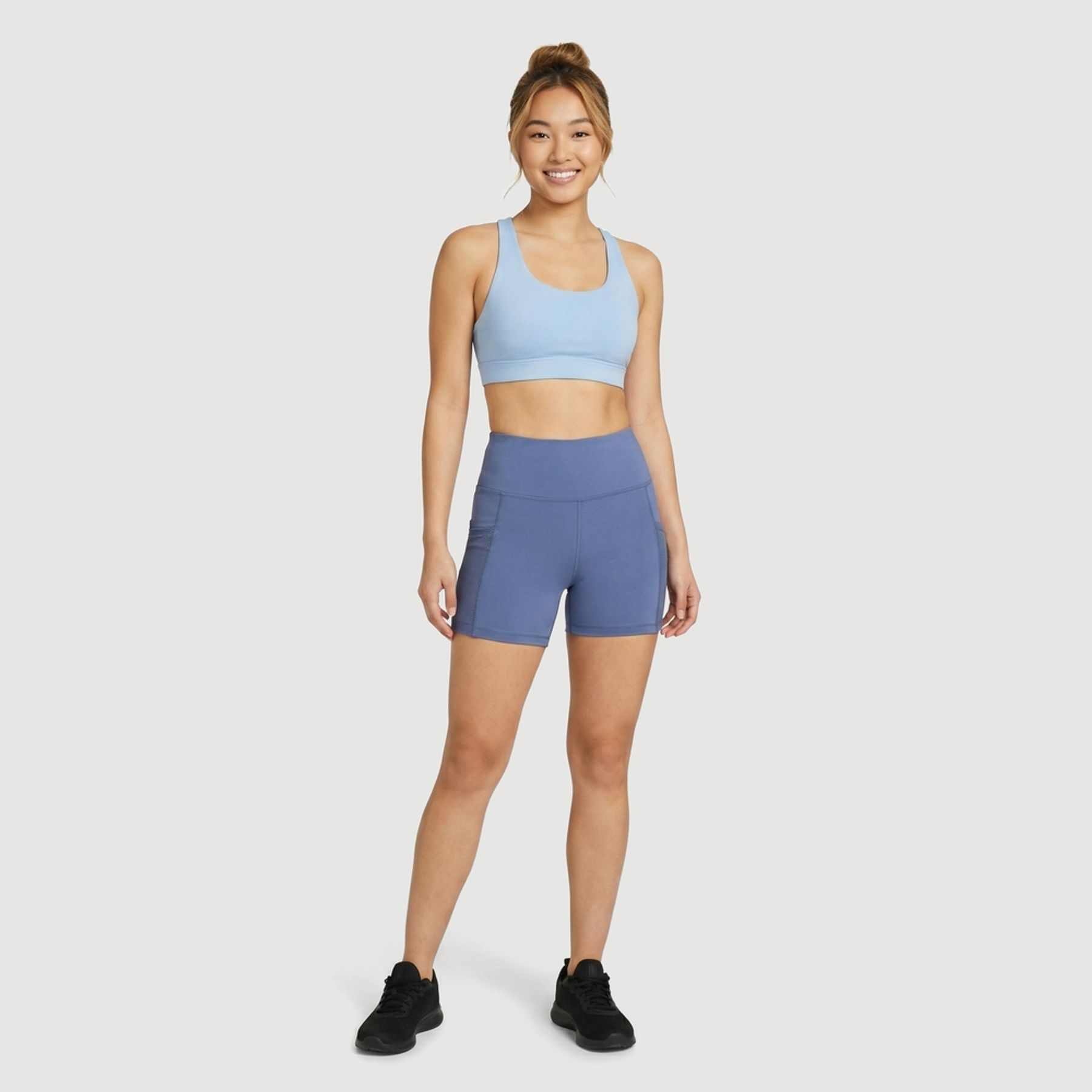 O design liso na cor azul tem cós alto para melhor ajuste ao corpo, bolsos laterais funcionais e recortes laterais em tela/mesh que favorecem a ventilação. As costuras aparentes e o logo pequeno aplicado completam o visual com acabamento moderno.