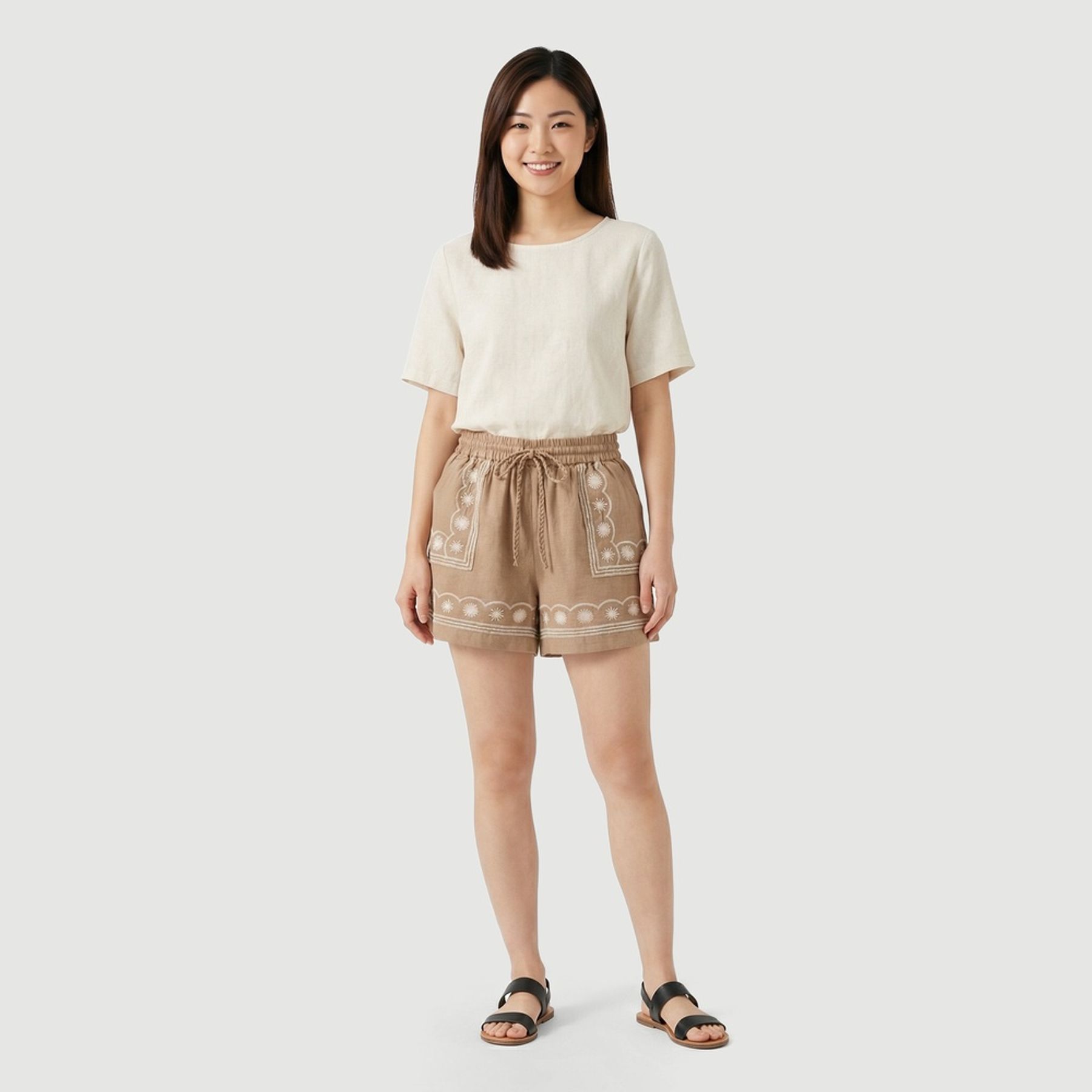 O design traz bordado floral estilizado em tom claro e faixas decorativas na barra e nos bolsos. O cós elástico com cordão trançado facilita o ajuste, enquanto os bolsos frontais aplicados acrescentam praticidade. A barra dobrada finaliza com um acabamento delicado.