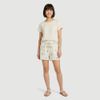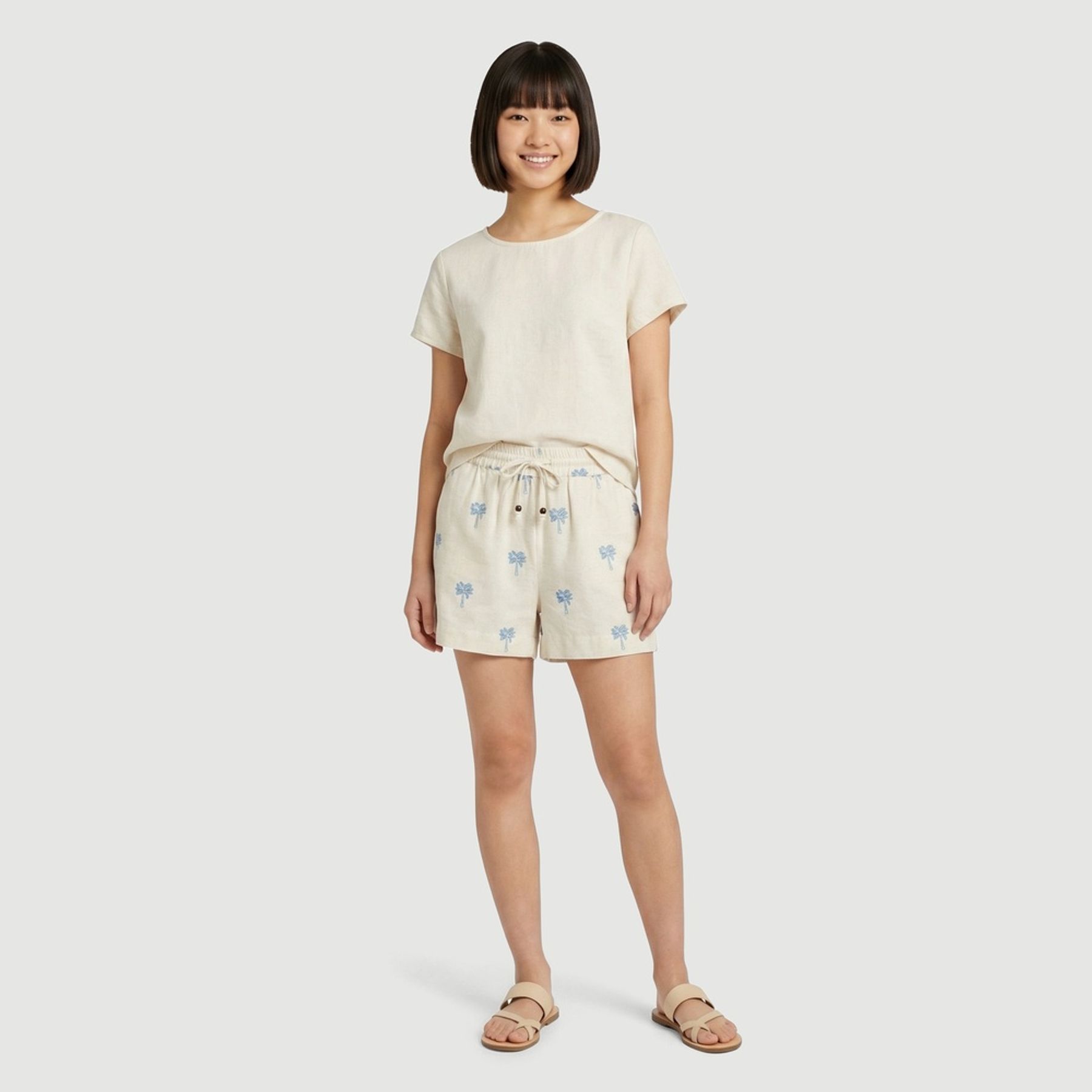 O bordado de coqueiros em azul traz um visual descontraído, enquanto o cós alto com elástico franzido e cordão com ponteiras facilita o ajuste e o uso no dia a dia.