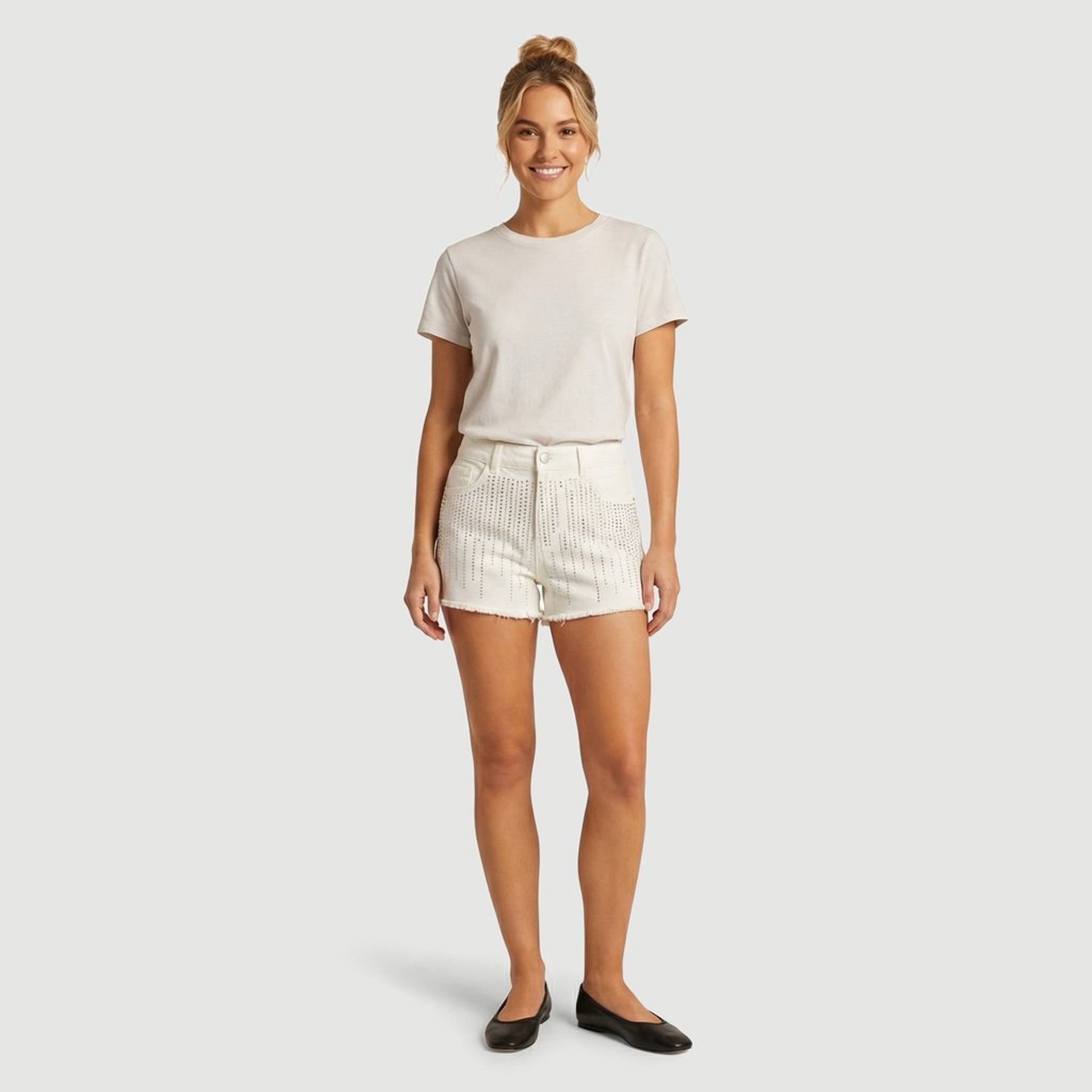 A peça é lisa na cor creme e recebe aplicação de strass prata em fileiras verticais na parte frontal, criando um elegante efeito de chuva. Conta com cós com passantes, fechamento por botão e bolsos frontais, combinando praticidade e estilo em diferentes combinações.