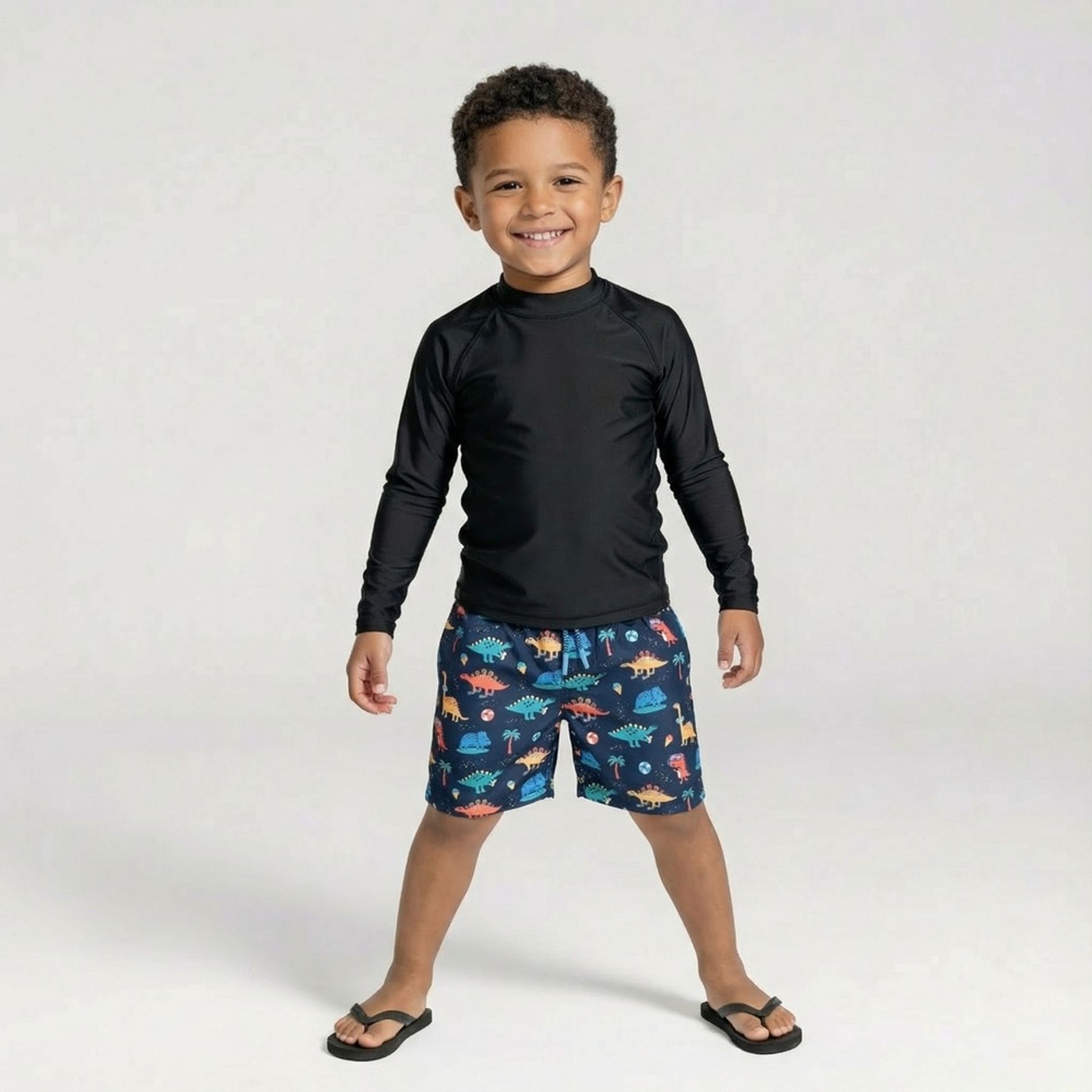 Short curto em 100% poliéster com estampa total de dinossauros em fundo azul marinho. Possui cós elástico e cordão com ponteira para ajuste seguro, sendo uma opção prática para uso em passeios e momentos de lazer.