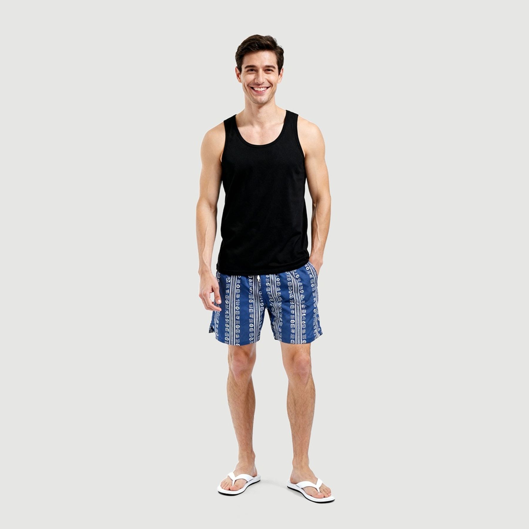 Economia de R$ 26,00O short de praia masculino Id Praia é ideal para usar na praia e na piscina com praticidade. Confeccionado em 100% poliéster, tem estampa geométrica com listras verticais e grafismos em branco sobre fundo azul-marinho.