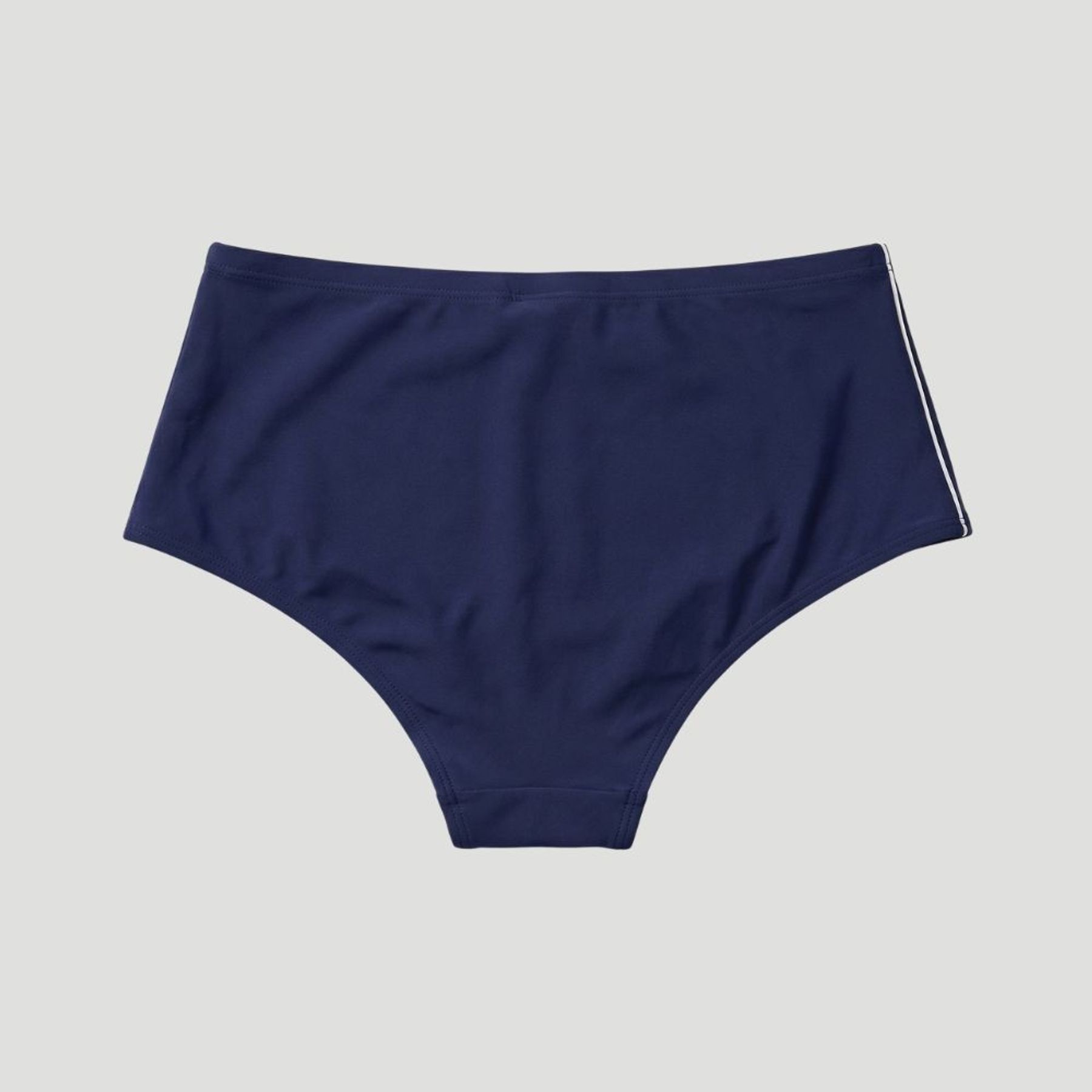 Confeccionada em material sintético de composição mista com predominância de poliamida, possui acabamento liso e barra com costura embutida para um caimento mais alinhado. O vivo lateral contrastante claro adiciona um detalhe moderno ao design, mantendo a peça versátil para diferentes estilos.
