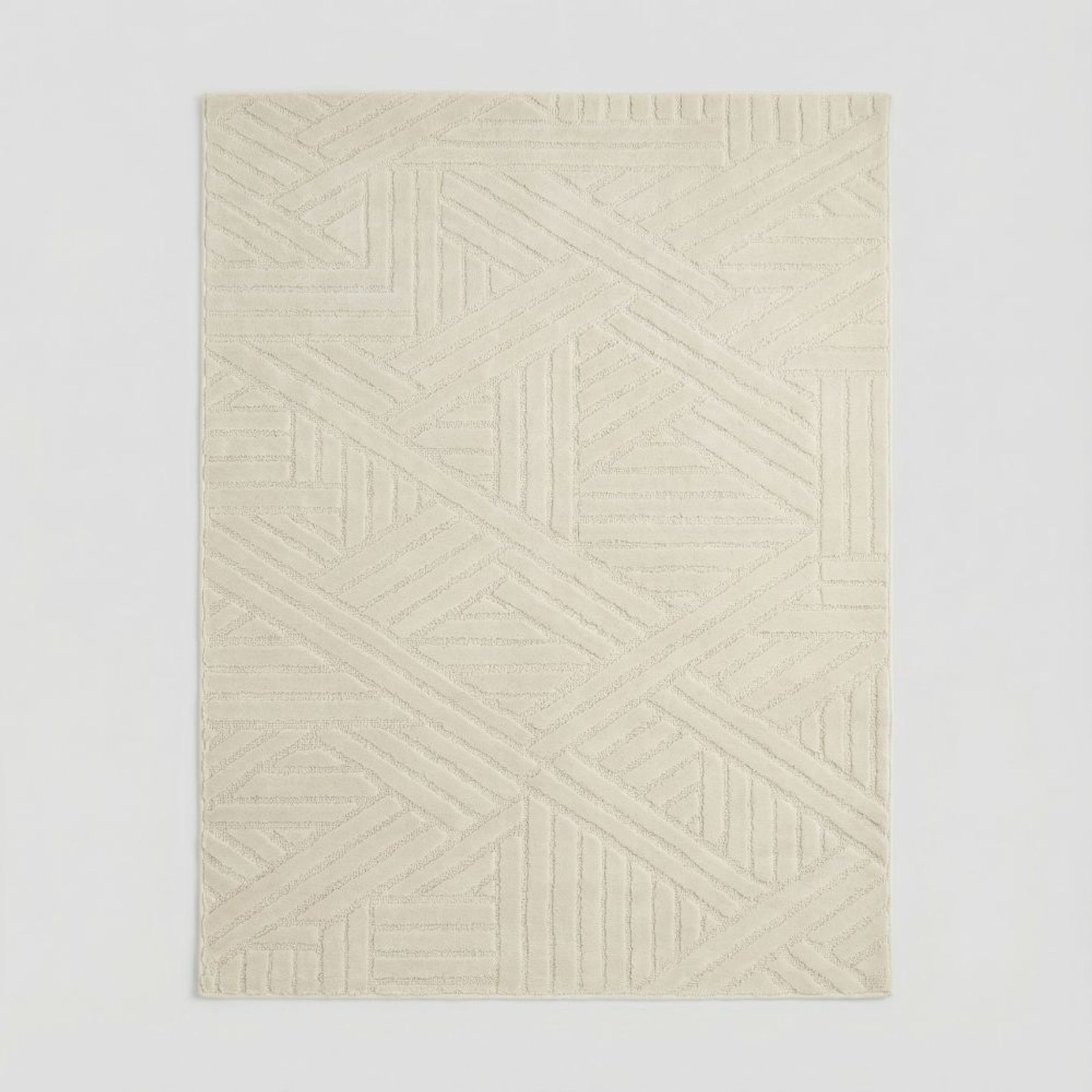 Tapete Relevo Trama 150x200 cm com design em relevo geométrico. Cor bege claro neutra que combina com decorações clássicas e modernas. Produzido em fibras sintéticas, é macio, resistente e fácil de limpar. Ideal para sala, quarto ou escritório.