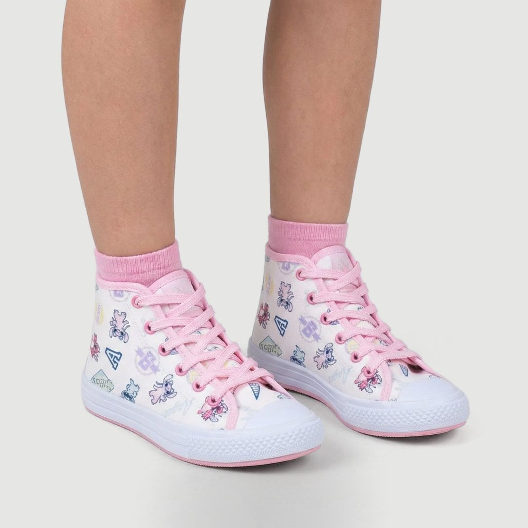 Economia de R$ 9,00Tênis feminino cano alto Disney Lilo & Stitch com estampa do Stitch em ilustrações pequenas estilo doodle. O cabedal em tom rosa traz cadarço e ilhoses na mesma cor, biqueira emborrachada branca e solado branco com detalhe rosa, ideal para compor looks casuais. Produzido em material sintético (100% PVC), é uma opção prática para passeios e momentos de lazer, com tema licenciado para fãs do personagem.