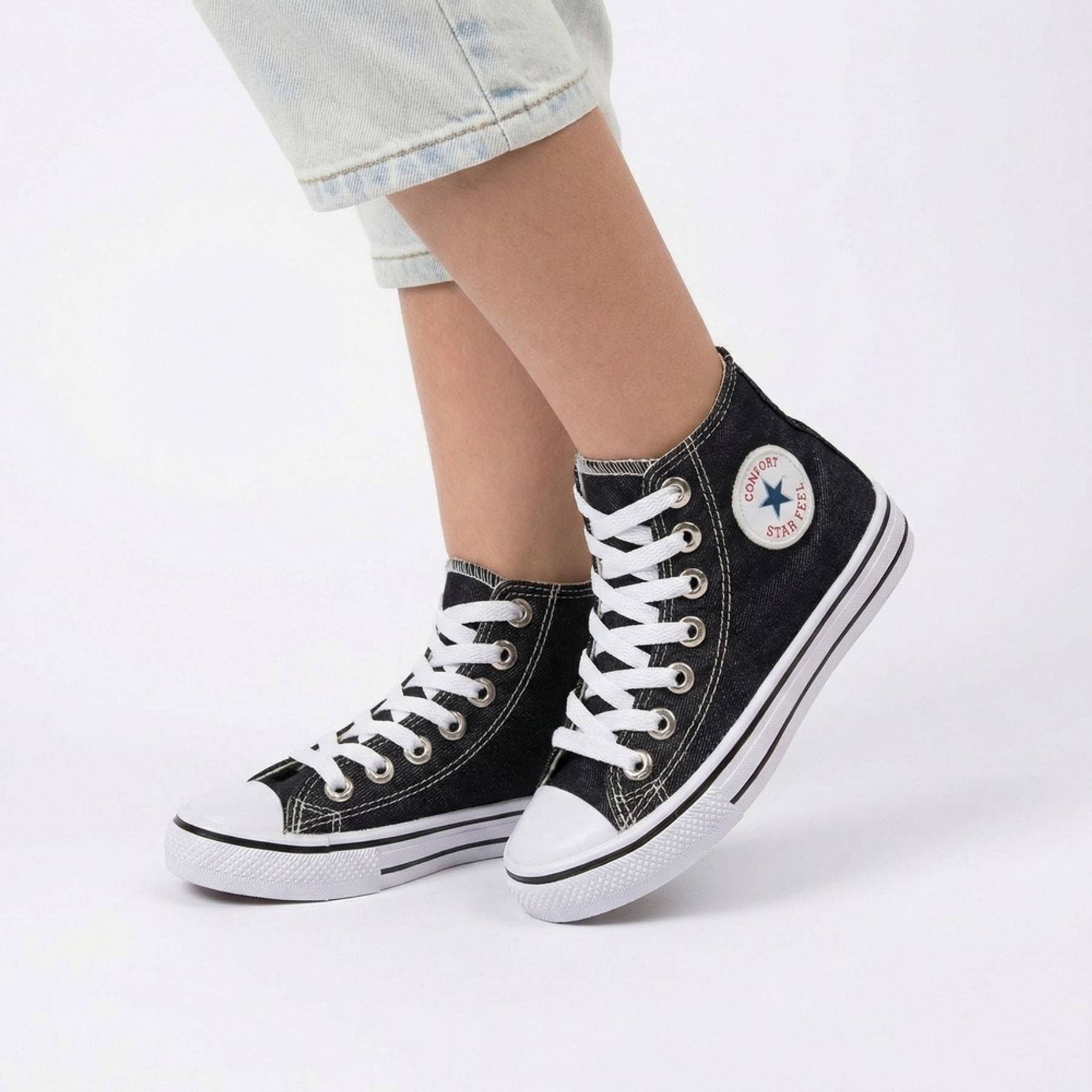 Tênis Feminino Cano Alto Com Cadarço Em Lona Preta