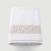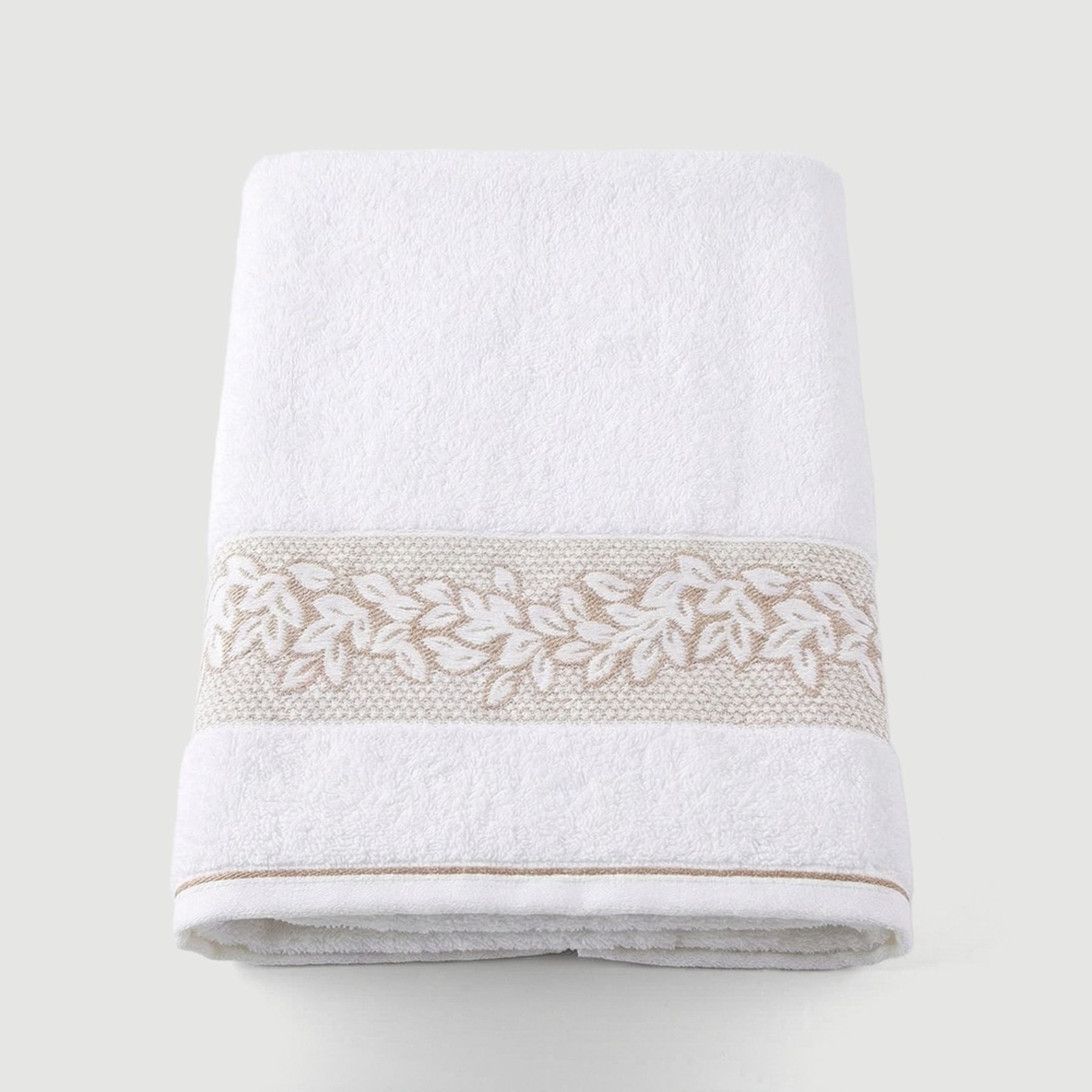 O visual clássico em branco ganha charme com a faixa decorativa em jacquard com folhagens e acabamento com barra de bainha e detalhe de linha fina, valorizando a composição do ambiente. Itens inclusos: 01 toalha de banho.
