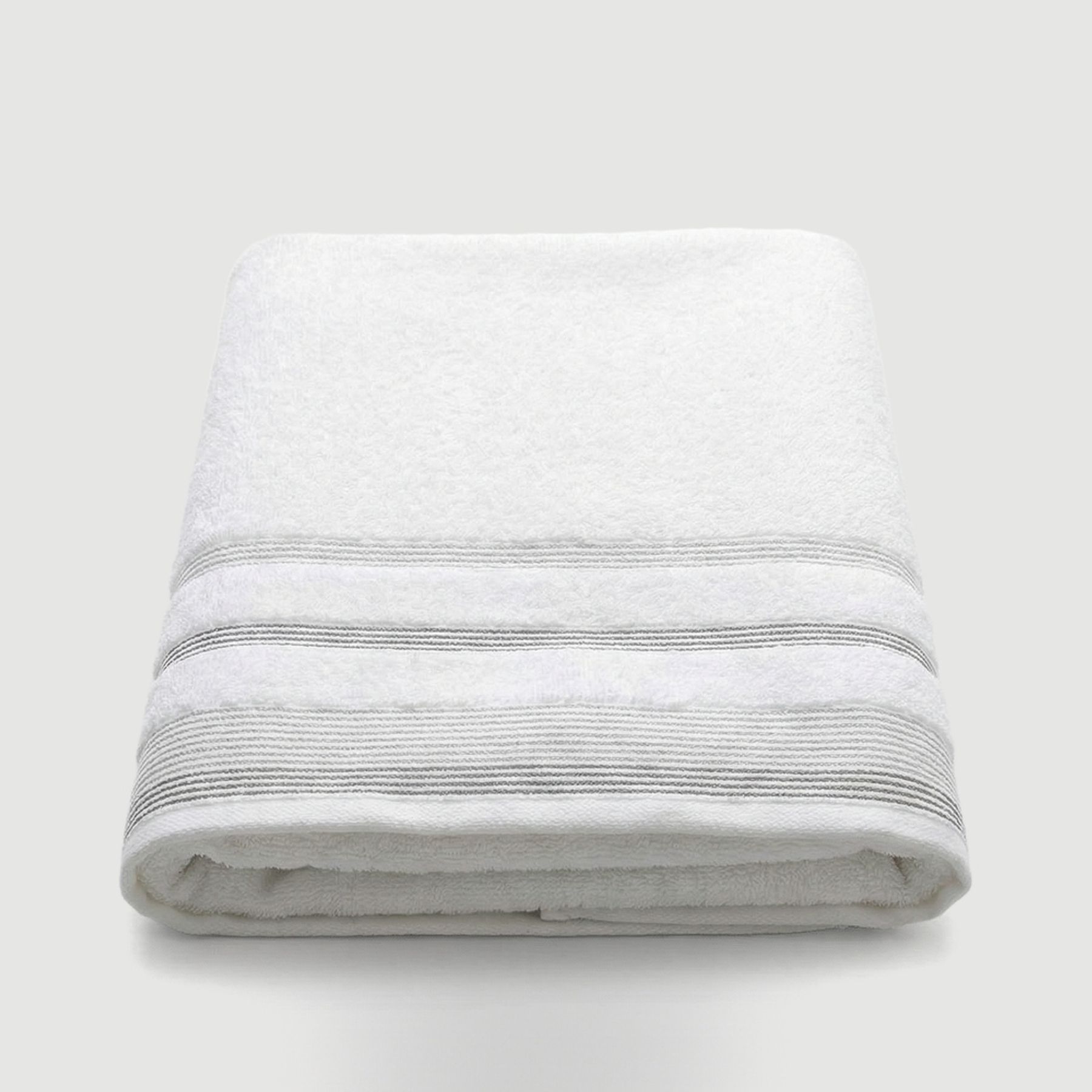 O design branco neutro conta com barra decorativa listrada em tom cinza, que adiciona um detalhe discreto e elegante. Possui acabamento em bainha nas bordas para um visual bem finalizado.