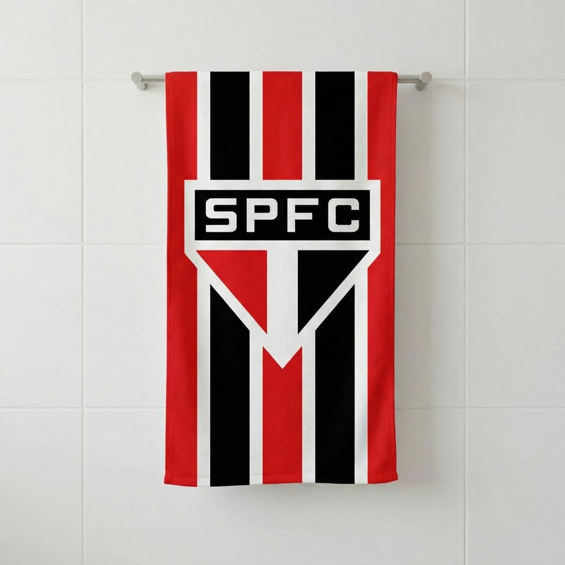 O visual esportivo traz listras verticais em vermelho, preto e branco, com escudo e sigla SPFC centralizados em estampa grande, perfeita para torcedores do São Paulo FC. Uma opção marcante para usar em casa, levar em viagens ou compor o enxoval com personalidade.