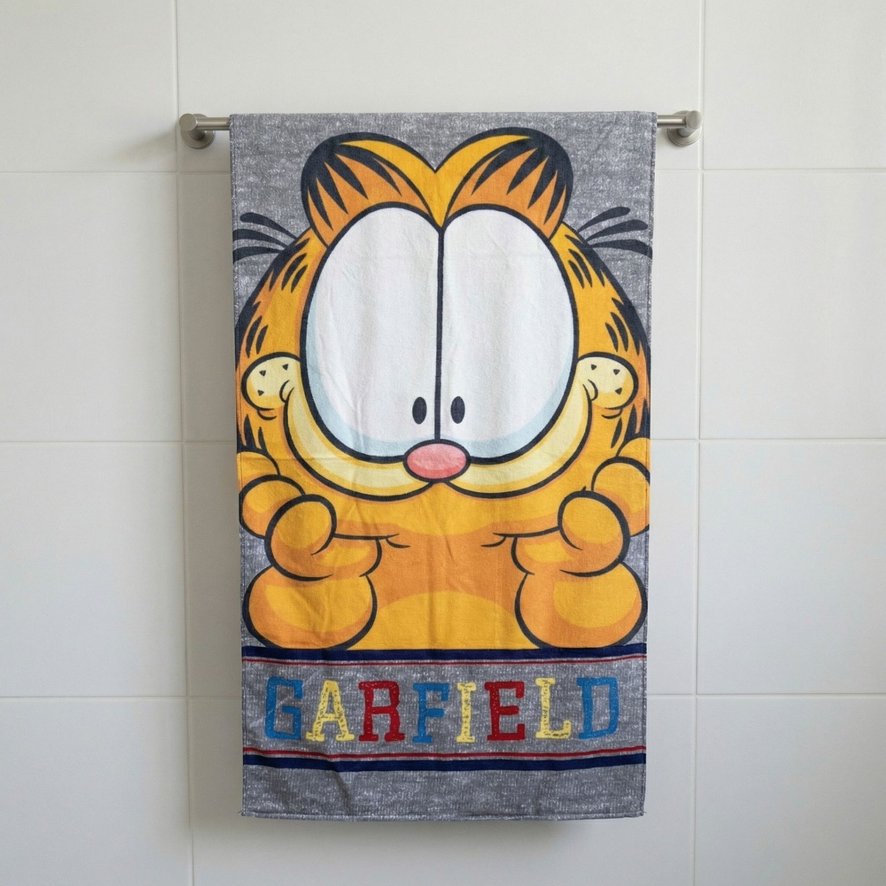 Na barra inferior, listras horizontais e a palavra “GARFIELD” em letras grandes e coloridas completam o visual. Possui acabamento com bainha nas bordas para um uso prático no dia a dia. Itens inclusos: 01 toalha de banho. Marca: Olinda Textil Ltda.