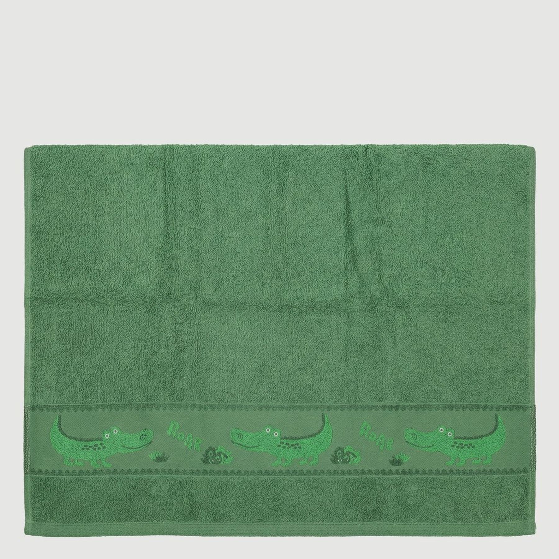Economia de R$ 3,00A toalha de banho Olinda em 100% algodão oferece toque felpudo e boa absorção após o banho. Na cor verde, possui barra decorativa com jacarés estilizados e o texto "RAWR", trazendo um visual temático. O acabamento com bainha nas bordas ajuda na durabilidade e no uso no dia a dia.