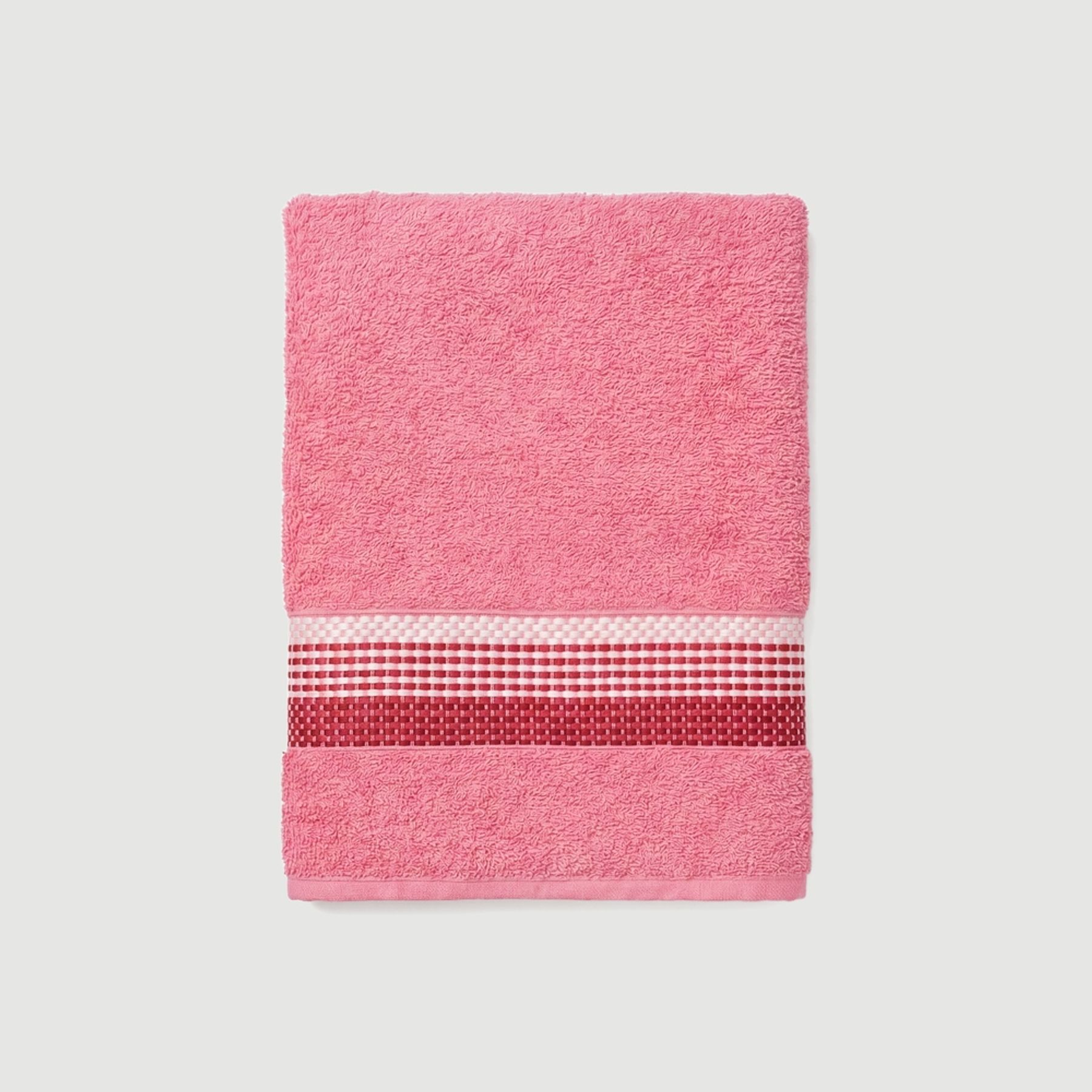 Em rosa, o design conta com faixa central em jacquard com padrão geométrico quadriculado e barra lisa bem acabada, combinando facilmente com diferentes estilos de banheiro.