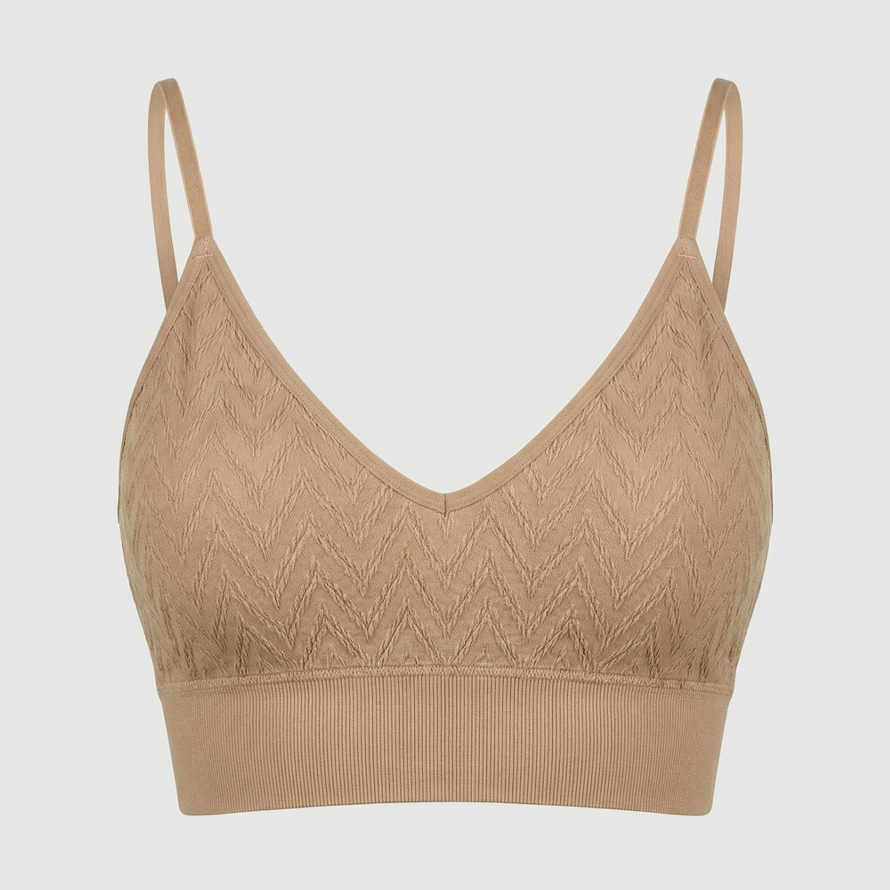 O modelo em marrom chocolate traz textura em relevo com desenho chevron, decote em V e alças finas reguláveis para melhor ajuste. A barra canelada com elástico largo proporciona mais firmeza, e a ausência de bojo aparente mantém o visual discreto. Itens inclusos: 01 top.