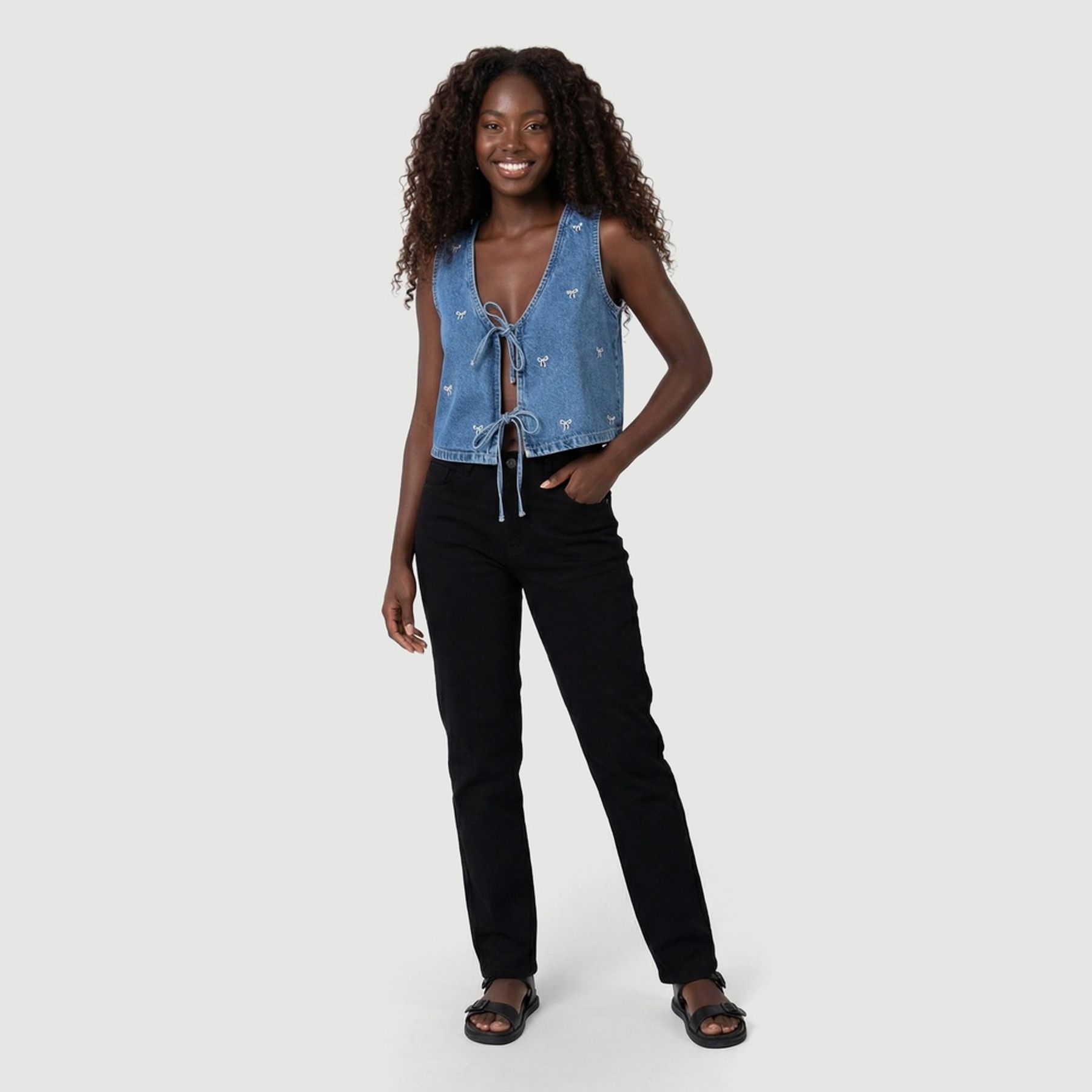 O modelo sem mangas possui decote V e fechamento frontal por amarração, permitindo um ajuste prático e um acabamento feminino. Com barra reta e comprimento mais curto, combina bem com camiseta, blusa, vestido ou top para criar produções versáteis.
