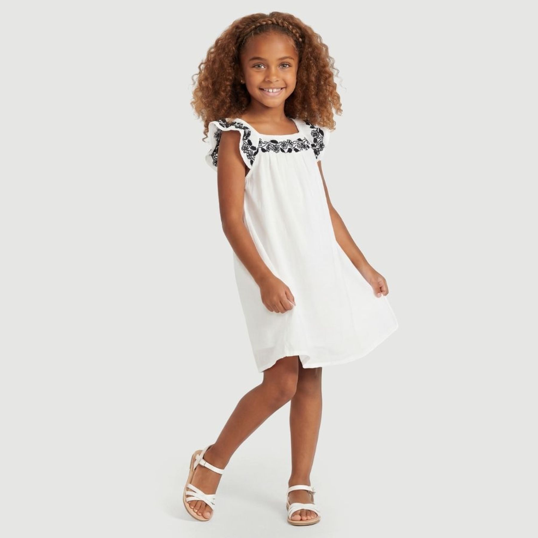 Em tom creme liso, o destaque fica para o bordado floral preto nas alças com babados, adicionando charme ao visual. Confeccionado em tecido misto com predominância de algodão, é uma ótima opção para passeios, escola e momentos especiais com praticidade.