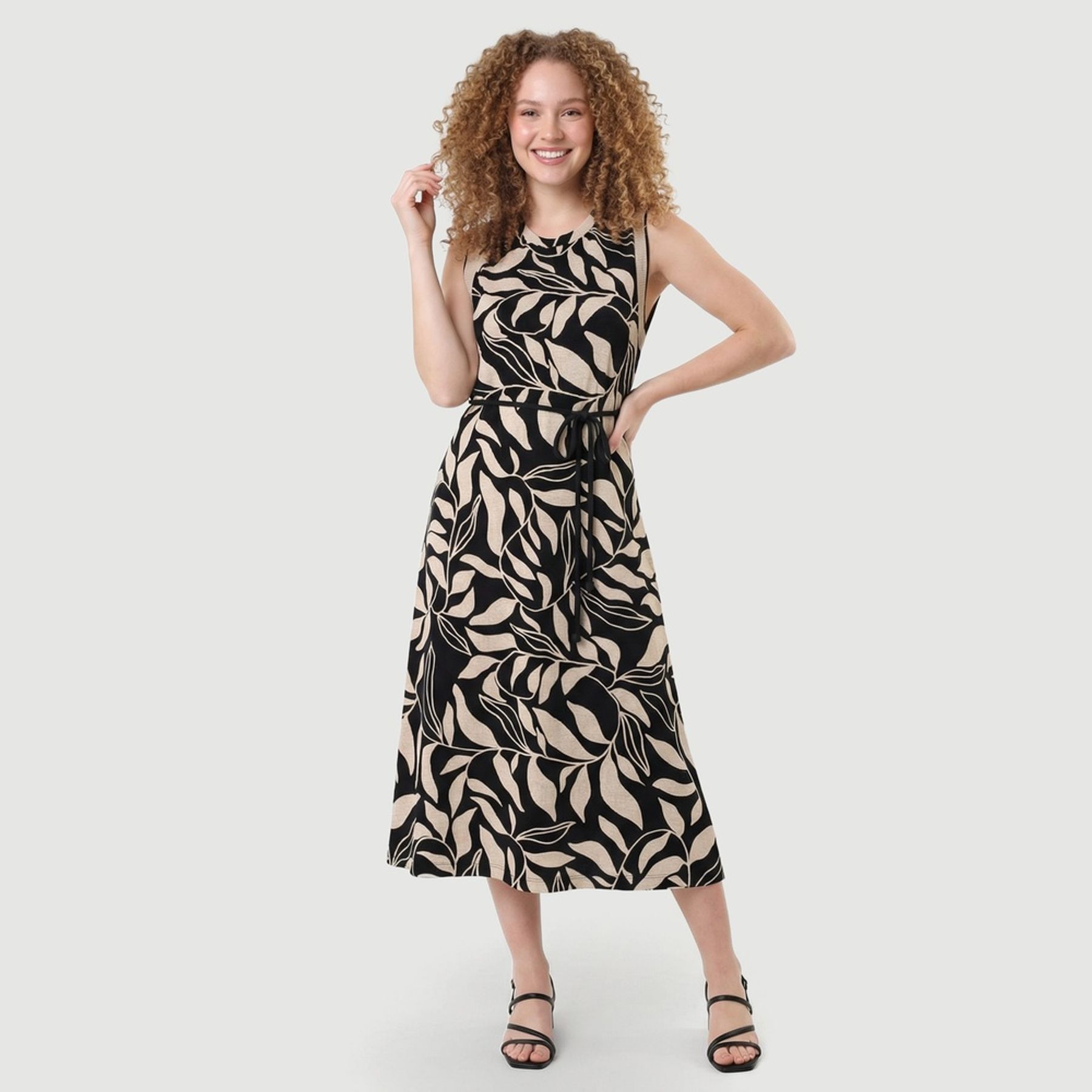 Economia de R$ 12,00O vestido feminino midi Viva Casual é uma opção prática e elegante para compor produções versáteis. A estampa floral de folhagens grandes em alto contraste traz fundo preto com desenho claro, criando um visual marcante e fácil de combinar.
