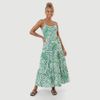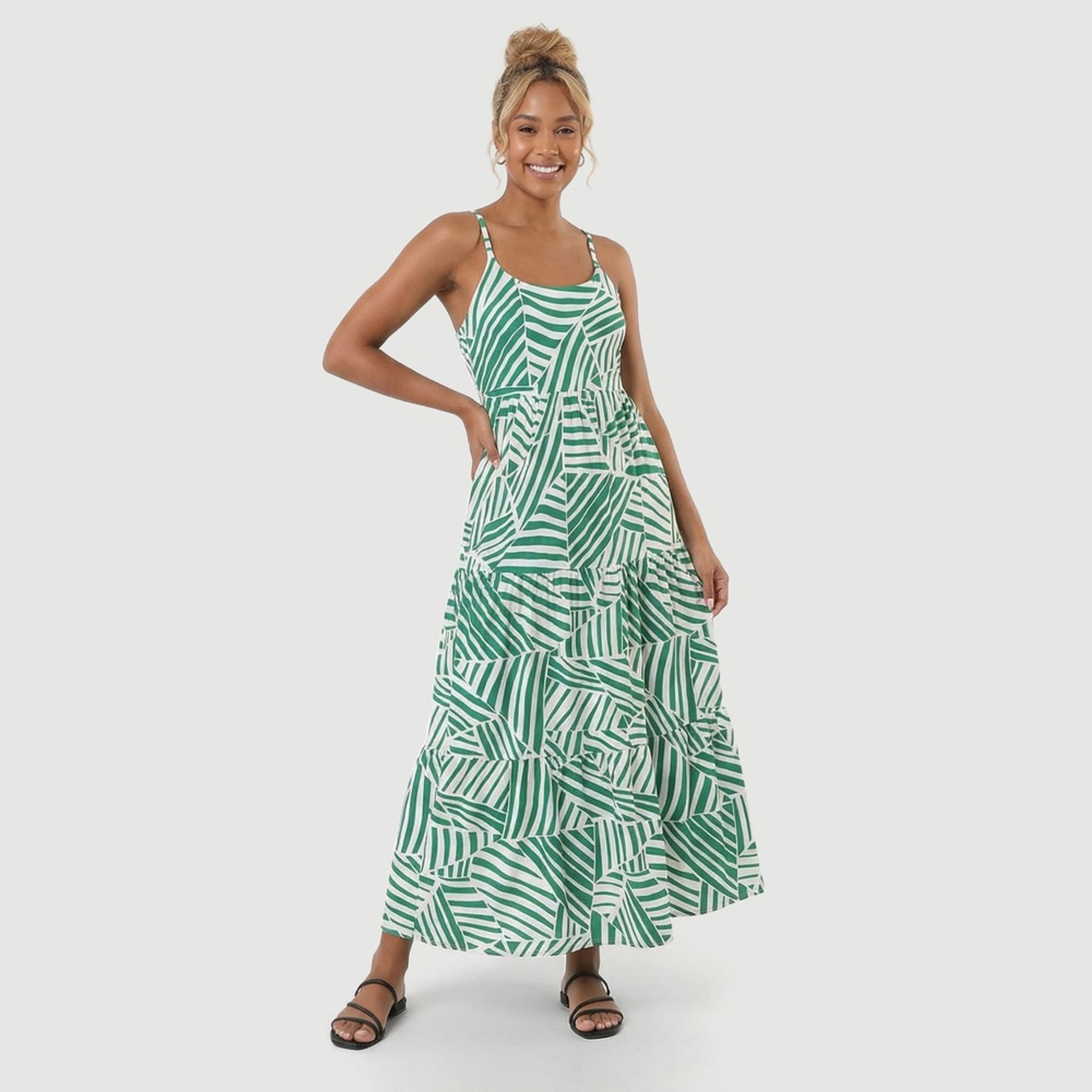 Economia de R$ 50,00Vestido feminino Viva Casual sem manga, com alças finas e decote reto, ideal para passeios e dias quentes. O modelo longo com recortes em camadas traz movimento, enquanto a estampa geométrica em tons de verde destaca o visual.